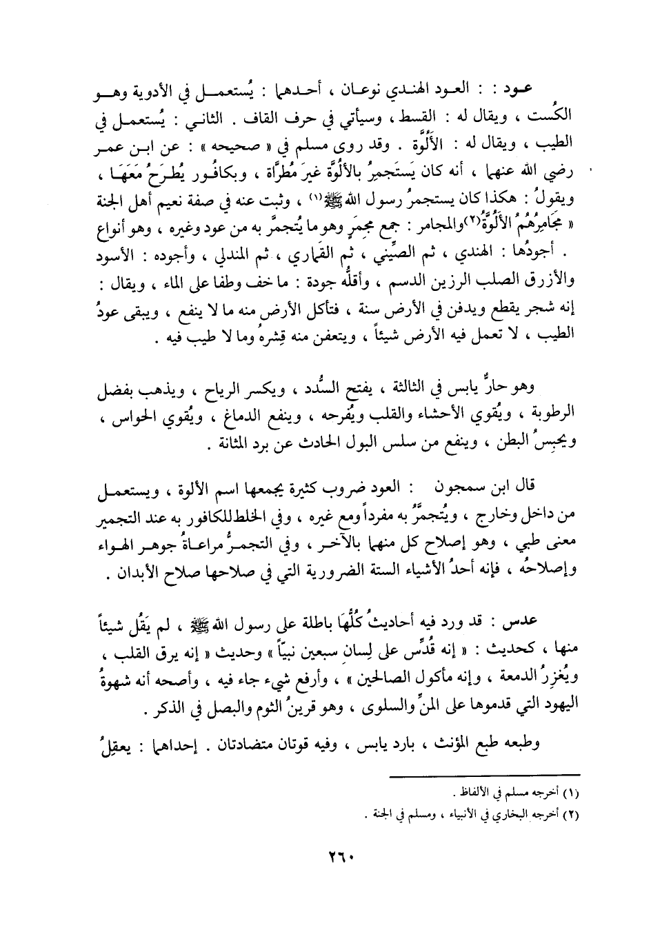 عود: الْعُودُ الْهِنْدِيُّ نَوْعَانِ، أَحَدُهُمَا: يُسْتَعْمَلُ فِي الْأَدْوِيَةِ وَهُوَ الْكُسْتُ، وَيُقَالُ لَهُ: الْقُسْطُ، وَسَيَأْتِي فِي حَرْفِ الْقَافِ. الثَّانِي: يُسْتَعْمَلُ فِي الطِّيبِ، وَيُقَالُ لَهُ: الْأَلُوَّةُ. وَقَدْ رَوَى مسلم فِي «صَحِيحِهِ» : عَنِ ابْنِ عُمَرَ رَضِيَ اللَّهُ عَنْهُمَا، أَنَّهُ كَانَ يَسْتَجْمِرُ بِالْأَلُوَّةِ غَيْرَ مُطَرَّاةٍ، وَبِكَافُورٍ يُطْرَحُ مَعَهَا، وَيَقُولُ: هَكَذَا كَانَ يَسْتَجْمِرُ رَسُولُ اللَّهِ صَلَّى اللَّهُ عَلَيْهِ وَسَلَّمَ «1» ، وَثَبَتَ عَنْهُ فِي صِفَةِ نَعِيمِ أَهْلِ الْجَنَّةِ «مَجَامِرُهُمُ الْأَلُوَّةُ «2» وَالْمَجَامِرُ: جَمْعُ مِجْمَرٍ وَهُوَ مَا يُتَجَمَّرُ بِهِ مِنْ عُودٍ وَغَيْرِهِ، وَهُوَ أَنْوَاعٌ. أَجْوَدُهَا: الْهِنْدِيُّ، ثُمَّ الصِّينِيُّ، ثُمَّ الْقَمَارِيُّ، ثُمَّ الْمَنْدَلِيُّ، وَأَجْوَدُهُ: الْأَسْوَدُ وَالْأَزْرَقُ الصُّلْبُ الرَّزِينُ الدَّسِمُ، وَأَقَلُّهُ جَوْدَةً: مَا خَفَّ وَطَفَا عَلَى الْمَاءِ، وَيُقَالُ:
