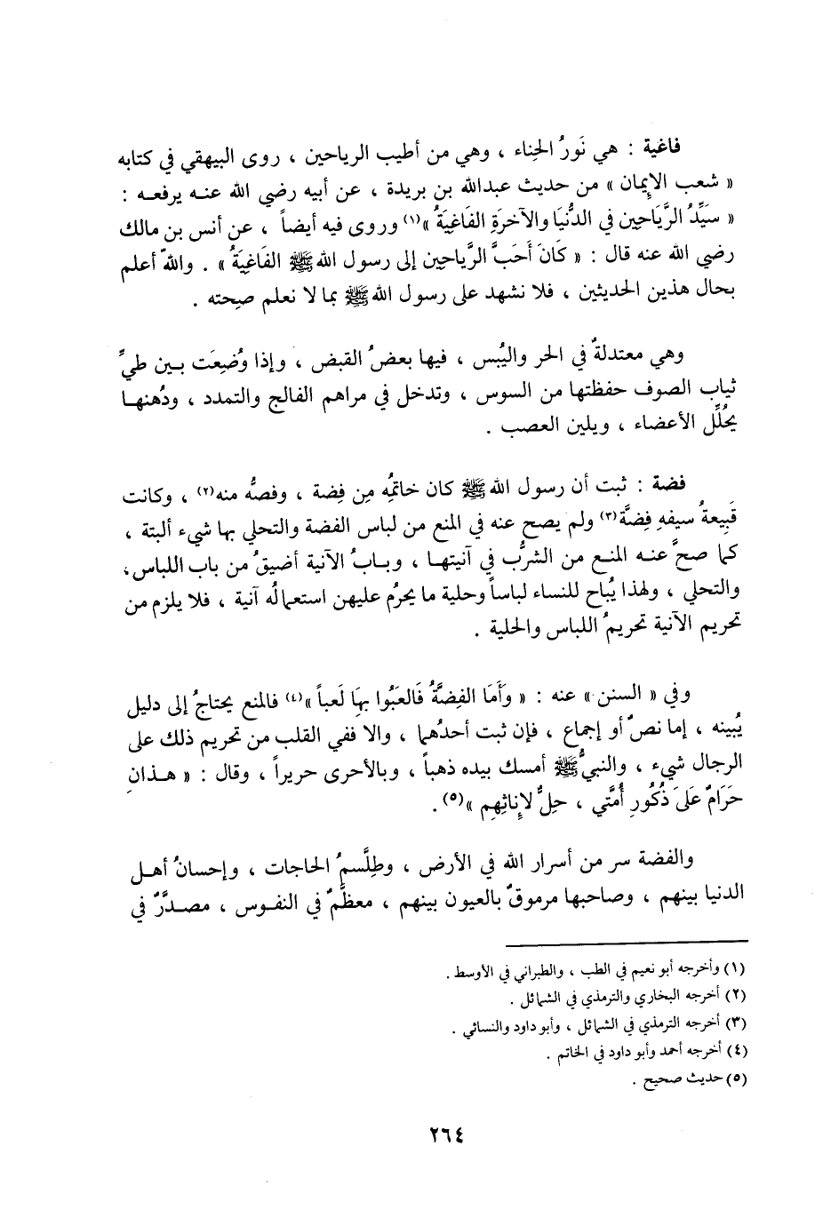 «سَيِّدُ الرَّيَاحِينِ فِي الدُّنْيَا وَالْآخِرَةِ الْفَاغِيَةُ» «1» وَرَوَى فِيهِ أَيْضًا، عَنْ أَنَسِ بْنِ مَالِكٍ رَضِيَ اللَّهُ عَنْهُ قَالَ: «كَانَ أَحَبَّ الرَّيَاحِينِ إِلَى رَسُولِ اللَّهِ صَلَّى اللَّهُ عَلَيْهِ وَسَلَّمَ الْفَاغِيَةُ» . وَاللَّهُ أَعْلَمُ بِحَالِ هَذَيْنِ الْحَدِيثَيْنِ، فَلَا نَشْهَدُ عَلَى رَسُولِ اللَّهِ صَلَّى اللَّهُ عَلَيْهِ وَسَلَّمَ بِمَا لَا نَعْلَمُ صِحَّتَهُ.