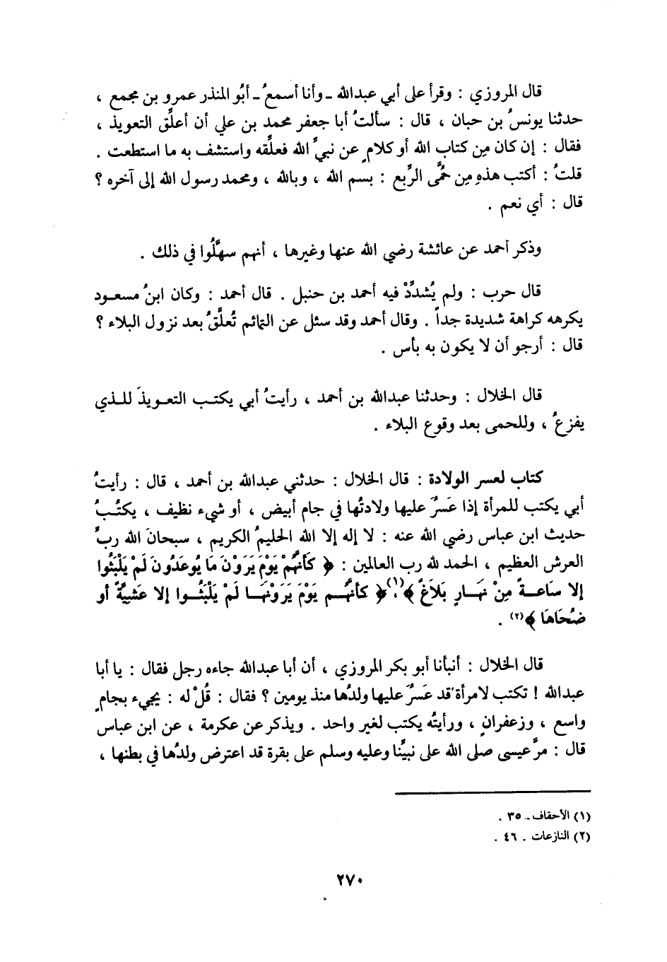 كتاب لعسر الولادة: قَالَ الخلال: حَدَّثَنِي عبد الله بن أحمد، قَالَ: رَأَيْتُ أَبِي يَكْتُبُ لِلْمَرْأَةِ إِذَا عَسُرَ عَلَيْهَا وِلَادَتُهَا فِي جَامٍ أَبْيَضَ، أَوْ شَيْءٍ نَظِيفٍ، يَكْتُبُ حَدِيثَ ابْنِ عَبَّاسٍ رَضِيَ اللَّهُ عَنْهُ: لَا إِلَهَ إِلَّا اللَّهُ الْحَلِيمُ الْكَرِيمُ، سُبْحَانَ اللَّهِ رَبِّ الْعَرْشِ الْعَظِيمِ، الْحَمْدُ لِلَّهِ رَبِّ الْعَالَمِينَ: كَأَنَّهُمْ يَوْمَ يَرَوْنَ مَا يُوعَدُونَ لَمْ يَلْبَثُوا إِلَّا ساعَةً مِنْ نَهارٍ بَلاغٌ «1» ، كَأَنَّهُمْ يَوْمَ يَرَوْنَها لَمْ يَلْبَثُوا إِلَّا عَشِيَّةً أَوْ ضُحاها «2» .