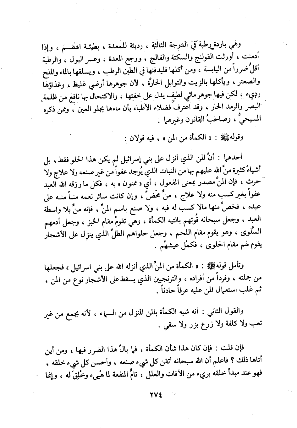 فَإِنْ قُلْتَ: فَإِنْ كَانَ هَذَا شَأْنَ الْكَمْأَةِ، فَمَا بَالُ هَذَا الضَّرَرِ فِيهَا، وَمِنْ أَيْنَ أَتَاهَا ذَلِكَ؟ فَاعْلَمْ أَنَّ اللَّهَ سُبْحَانَهُ أَتْقَنَ كُلَّ شَيْءٍ صَنَعَهُ، وَأَحْسَنَ كُلَّ شَيْءٍ خَلَقَهُ، فَهُوَ عِنْدَ مَبْدَأِ خَلْقِهِ بَرِيءٌ مِنَ الْآفَاتِ والعلل، تامّ المنفعة لما هيىء وَخُلِقَ لَهُ، وَإِنَّمَا