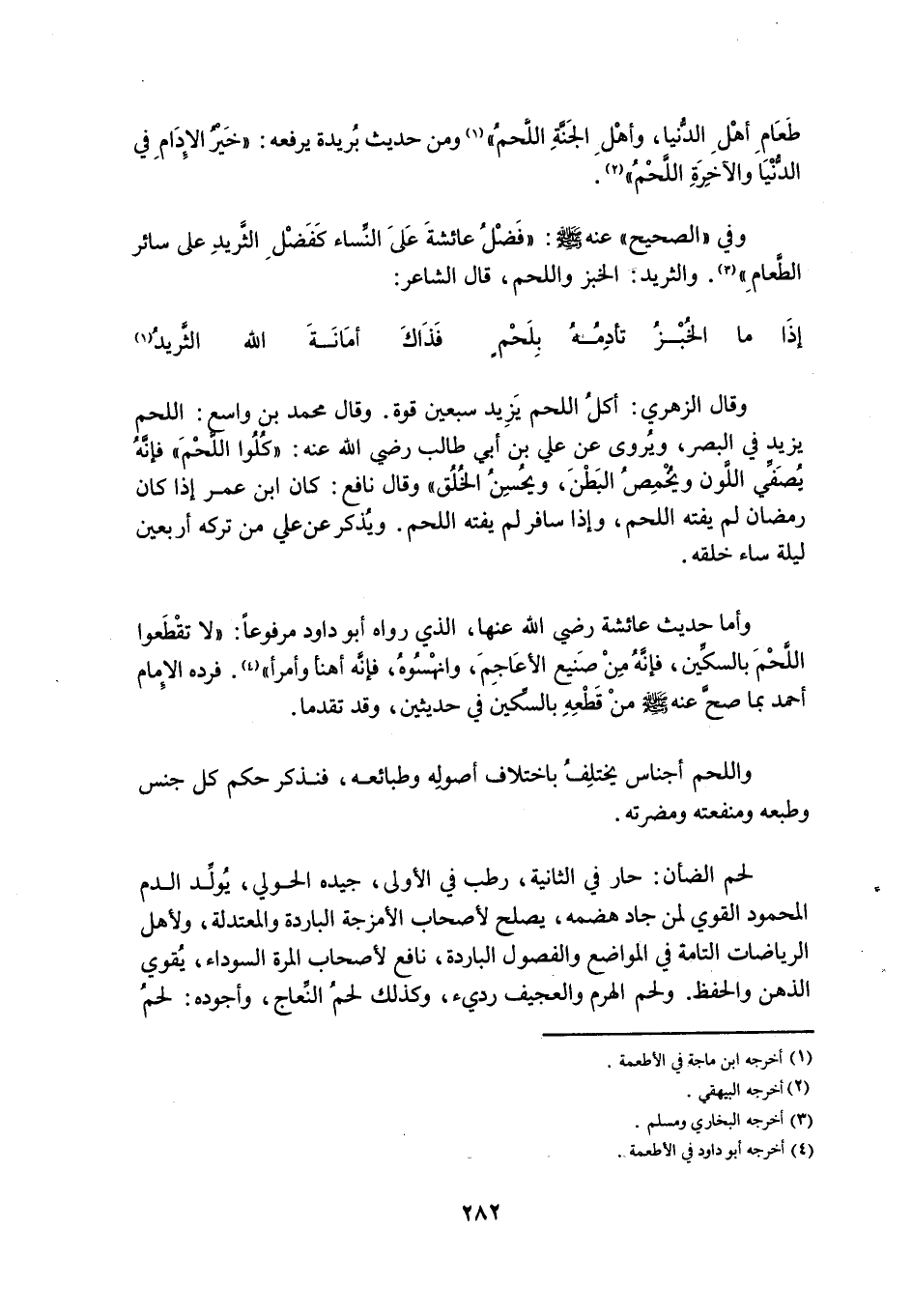 وَاللَّحْمُ أَجْنَاسٌ يَخْتَلِفُ بِاخْتِلَافِ أُصُولِهِ وَطَبَائِعِهِ، فَنَذْكُرُ حُكْمَ كُلِّ جِنْسٍ وَطَبْعَهُ وَمَنْفَعَتَهُ وَمَضَرَّتَهُ.