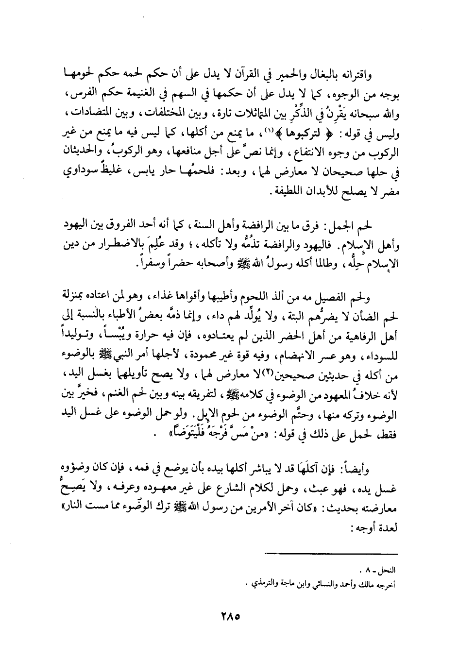 لَحْمُ الْجَمَلِ: فَرْقُ مَا بَيْنَ الرَّافِضَةِ وَأَهْلِ السُّنَّةِ، كَمَا أَنَّهُ أَحَدُ الْفُرُوقِ بَيْنَ الْيَهُودِ وَأَهْلِ الْإِسْلَامِ. فَالْيَهُودُ وَالرَّافِضَةُ تَذُمُّهُ وَلَا تَأْكُلُهُ،؛ وَقَدْ عُلِمَ بِالِاضْطِرَارِ مِنْ دِينِ الْإِسْلَامِ حِلُّهُ، وَطَالَمَا أَكَلَهُ رَسُولِ اللَّهِ صَلَّى اللَّهُ عَلَيْهِ وَسَلَّمَ وَأَصْحَابِهِ حضرا وسفرا.