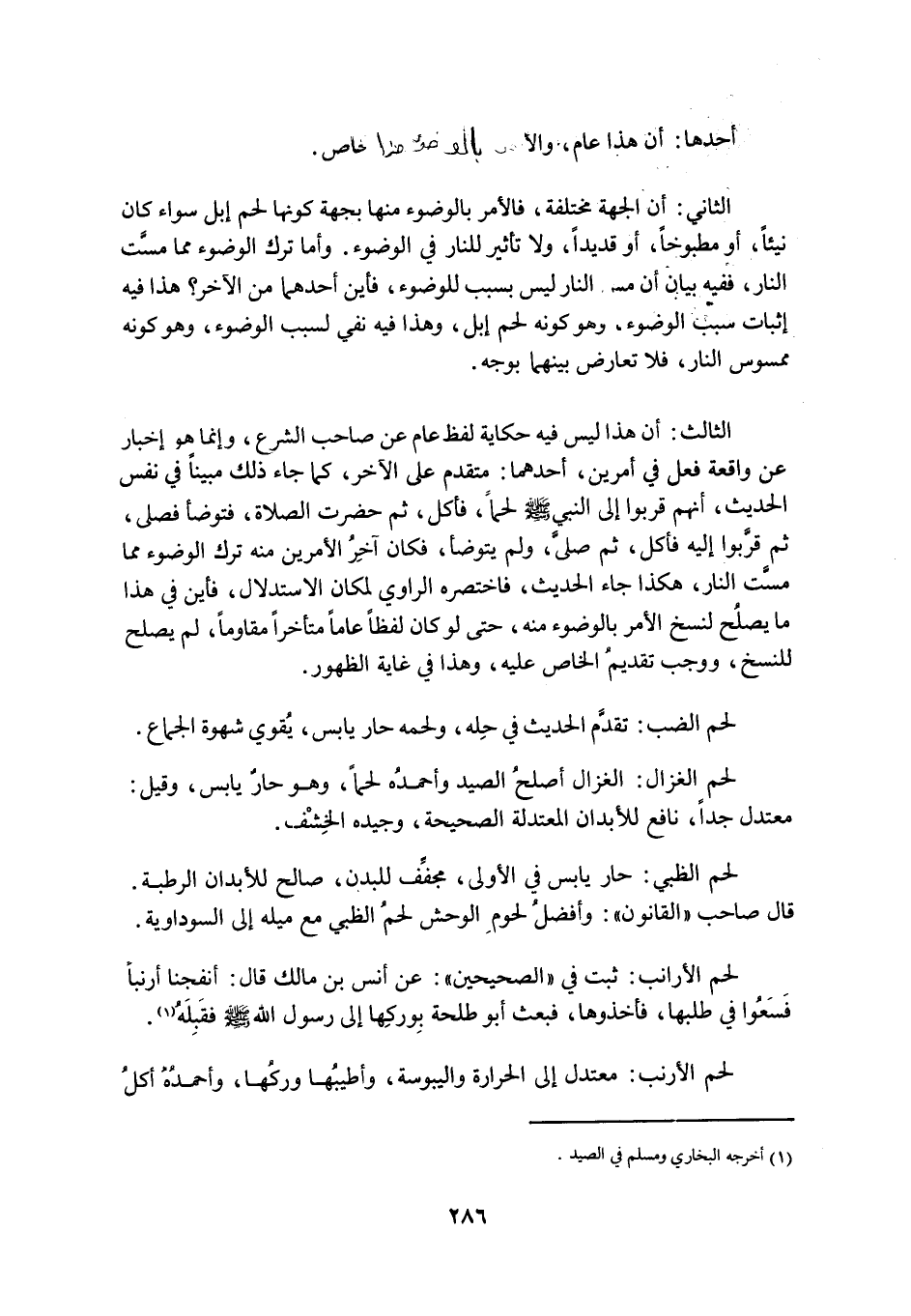 الثَّالِثُ: أَنَّ هَذَا لَيْسَ فِيهِ حِكَايَةُ لَفْظٍ عَامٍّ عَنْ صَاحِبِ الشَّرْعِ، وَإِنَّمَا هُوَ إِخْبَارٌ عَنْ وَاقِعَةِ فِعْلٍ فِي أَمْرَيْنِ، أَحَدُهُمَا: مُتَقَدِّمٌ عَلَى الْآخَرِ، كَمَا جَاءَ ذَلِكَ مُبَيَّنًا فِي نَفْسِ الْحَدِيثِ، أَنَّهُمْ قَرَّبُوا إِلَى النَّبِيِّ صَلَّى اللَّهُ عَلَيْهِ وَسَلَّمَ لَحْمًا، فَأَكَلَ، ثُمَّ حَضَرَتِ الصَّلَاةُ، فَتَوَضَّأَ فَصَلَّى، ثُمَّ قَرَّبُوا إِلَيْهِ فَأَكَلَ، ثُمَّ صَلَّى، وَلَمْ يَتَوَضَّأْ، فَكَانَ آخِرُ الْأَمْرَيْنِ مِنْهُ تَرْكَ الْوُضُوءِ مِمَّا مَسَّتِ النَّارُ، هَكَذَا جَاءَ الْحَدِيثُ، فَاخْتَصَرَهُ الرَّاوِي لِمَكَانِ الِاسْتِدْلَالِ، فَأَيْنَ فِي هَذَا مَا يَصْلُحُ لِنَسْخِ الْأَمْرِ بِالْوُضُوءِ مِنْهُ، حَتَّى لَوْ كَانَ لَفْظًا عَامًّا مُتَأَخِّرًا مُقَاوِمًا، لَمْ يَصْلُحْ لِلنَّسْخِ، وَوَجَبَ تَقْدِيمُ الْخَاصِّ عَلَيْهِ، وَهَذَا فِي غَايَةِ الظُّهُورِ.