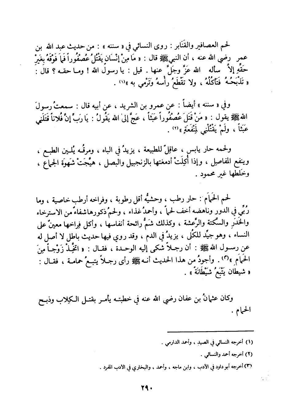 لَحْمُ الْعَصَافِيرِ وَالْقَنَابِرِ: رَوَى النَّسَائِيُّ فِي «سُنَنِهِ» : مِنْ حَدِيثِ عبد الله بن عمر رَضِيَ اللَّهُ عَنْهُ، أَنَّ النَّبِيَّ صَلَّى اللَّهُ عَلَيْهِ وَسَلَّمَ قَالَ: «مَا مِنْ إِنْسَانٍ يَقْتُلُ عُصْفُورًا فَمَا فَوْقَهُ بِغَيْرِ حَقِّهِ إِلَّا سَأَلَهُ اللَّهُ عَزَّ وَجَلَّ عَنْهَا. قِيلَ: يَا رَسُولَ اللَّهِ! وَمَا حَقُّهُ؟ قَالَ: