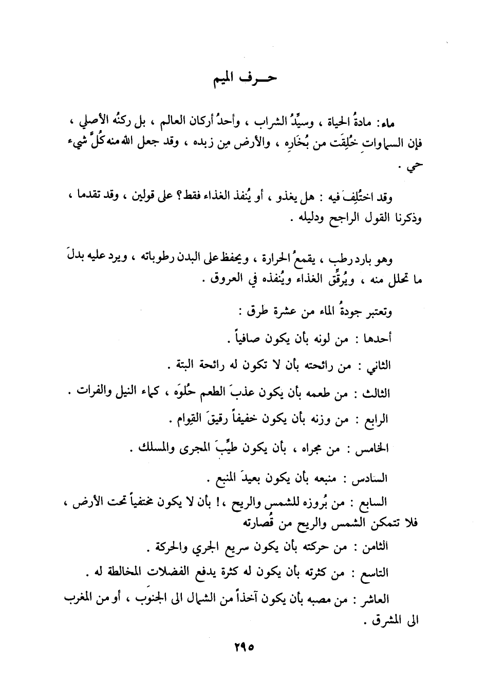 مَاءٌ: مَادَّةُ الْحَيَاةِ، وَسَيِّدُ الشَّرَابِ، وَأَحَدُ أَرْكَانِ الْعَالَمِ، بَلْ رُكْنُهُ الْأَصْلِيُّ، فَإِنَّ السَّمَاوَاتِ خُلِقَتْ مِنْ بُخَارِهِ، وَالْأَرْضَ مِنْ زَبَدِهِ، وَقَدْ جَعَلَ اللَّهُ مِنْهُ كُلَّ شَيْءٍ حَيٍّ.