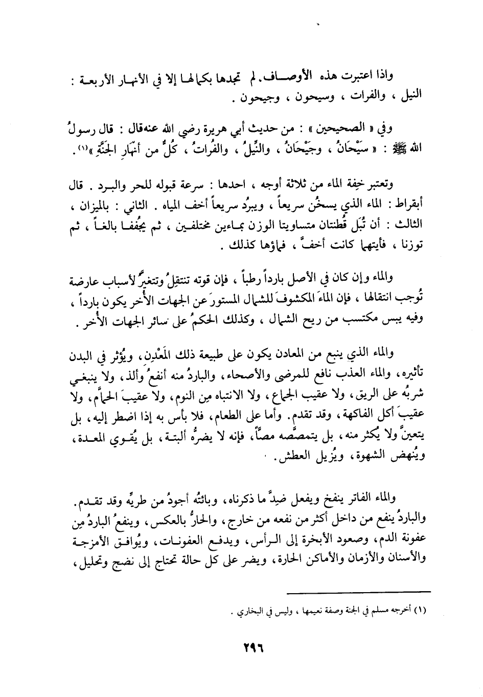 وَإِذَا اعْتَبَرْتَ هَذِهِ الْأَوْصَافَ. لَمْ تَجِدْهَا بِكَمَالِهَا إِلَّا فِي الْأَنْهَارِ الْأَرْبَعَةِ:
