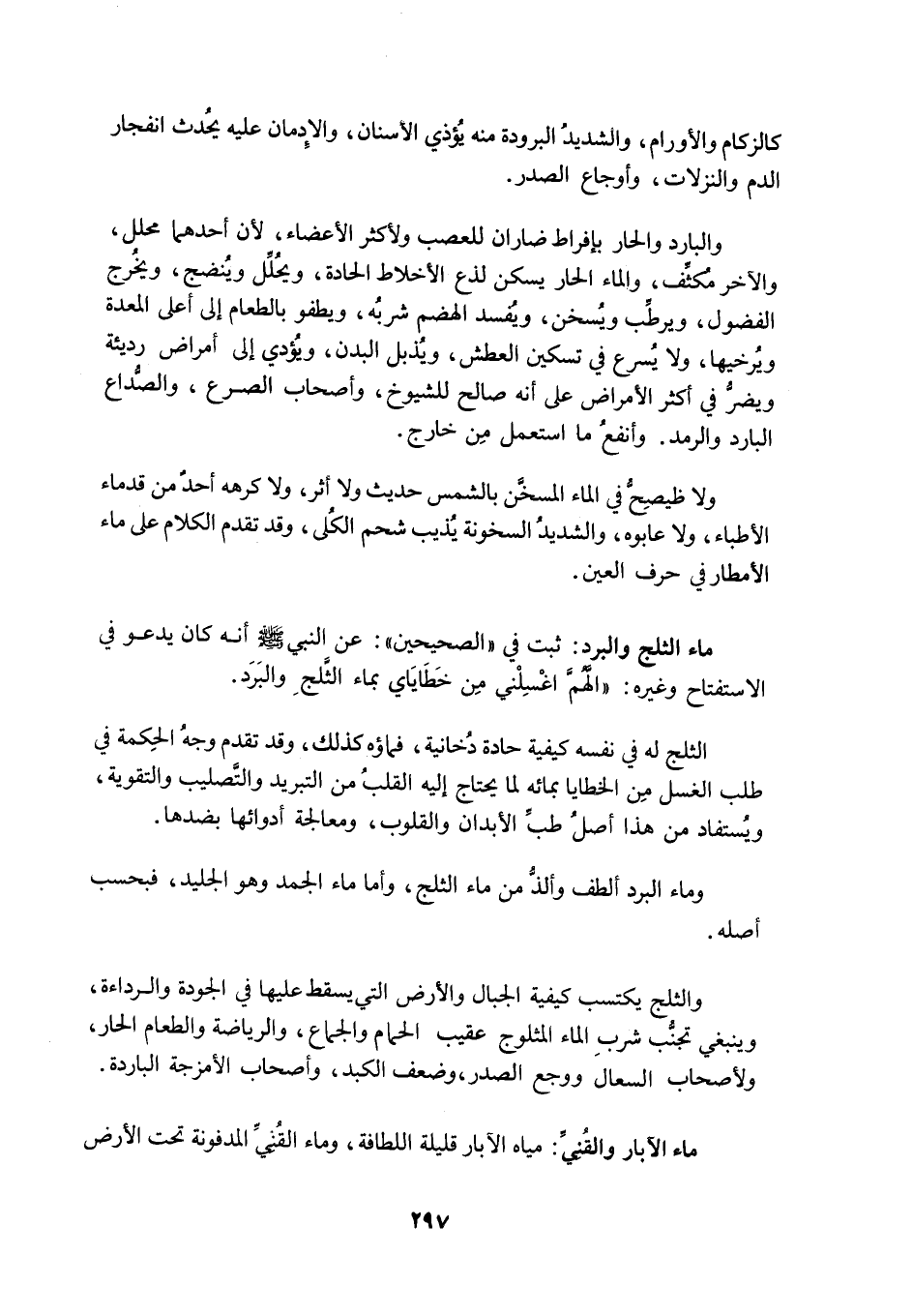 الثَّلْجُ لَهُ فِي نَفْسِهِ كَيْفِيَّةٌ حَادَّةٌ دُخَّانِيَّةٌ، فَمَاؤُهُ كَذَلِكَ، وَقَدْ تَقَدَّمَ وَجْهُ الْحِكْمَةِ فِي طَلَبِ الْغَسْلِ مِنَ الْخَطَايَا بِمَائِهِ لِمَا يَحْتَاجُ إِلَيْهِ الْقَلْبُ مِنَ التَّبْرِيدِ وَالتَّصْلِيبِ وَالتَّقْوِيَةِ، وَيُسْتَفَادُ مِنْ هَذَا أَصْلُ طِبِّ الْأَبْدَانِ وَالْقُلُوبِ، وَمُعَالَجَةِ أَدْوَائِهَا بِضِدِّهَا.