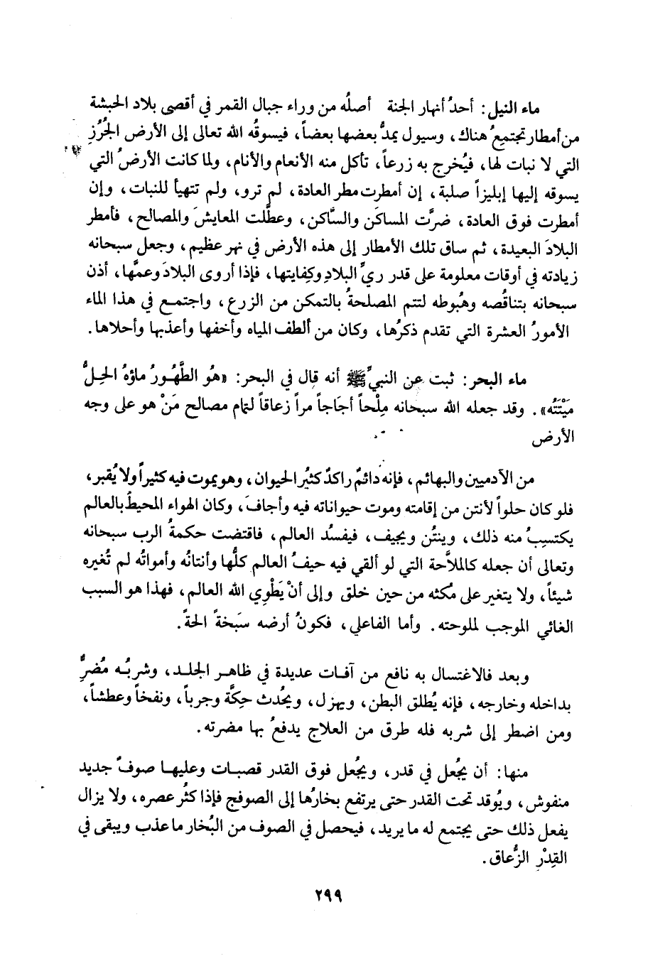 ماء النيل: أَحَدُ أَنْهَارِ الْجَنَّةِ أَصْلُهُ مِنْ وَرَاءِ جِبَالِ الْقَمَرِ فِي أَقْصَى بِلَادِ الْحَبَشَةِ مِنْ أَمْطَارٍ تَجْتَمِعُ هُنَاكَ، وَسُيُولٍ يَمُدُّ بَعْضُهَا بَعْضًا، فَيَسُوقُهُ اللَّهُ تَعَالَى إِلَى الْأَرْضِ الْجُرُزِ الَّتِي لَا نَبَاتَ لَهَا، فَيُخْرِجُ بِهِ زَرْعًا، تَأْكُلُ مِنْهُ الْأَنْعَامُ وَالْأَنَامُ، وَلَمَّا كَانَتِ الْأَرْضُ الَّتِي يَسُوقُهُ إِلَيْهَا إِبْلِيزًا صُلْبَةً، إِنْ أُمْطِرَتْ مَطَرَ الْعَادَةِ، لَمْ تُرْوَ، وَلَمْ تَتَهَيَّأْ لِلنَّبَاتِ، وَإِنْ أُمْطِرَتْ فَوْقَ الْعَادَةِ، ضَرَّتِ الْمَسَاكِنَ وَالسَّاكِنَ، وَعَطَّلَتِ الْمَعَايِشَ وَالْمَصَالِحَ، فَأَمْطَرَ الْبِلَادَ الْبَعِيدَةَ، ثُمَّ سَاقَ تِلْكَ الْأَمْطَارَ إِلَى هَذِهِ الْأَرْضِ فِي نَهْرٍ عَظِيمٍ، وَجَعَلَ سُبْحَانَهُ زِيَادَتَهُ فِي أَوْقَاتٍ مَعْلُومَةٍ عَلَى قَدْرِ رَيِّ الْبِلَادِ وَكِفَايَتِهَا، فَإِذَا أَرْوَى الْبِلَادَ وَعَمَّهَا، أَذِنَ سُبْحَانَهُ بِتَنَاقُصِهِ وَهُبُوطِهِ لِتَتِمَّ الْمَصْلَحَةُ بِالتَّمَكُّنِ مِنَ الزَّرْعِ، وَاجْتَمَعَ فِي هَذَا الْمَاءِ الْأُمُورُ الْعَشْرَةُ الَّتِي تَقَدَّمَ ذِكْرُهَا، وَكَانَ مِنْ أَلْطَفِ الْمِيَاهِ وَأَخَفِّهَا وَأَعْذَبِهَا وَأَحْلَاهَا.