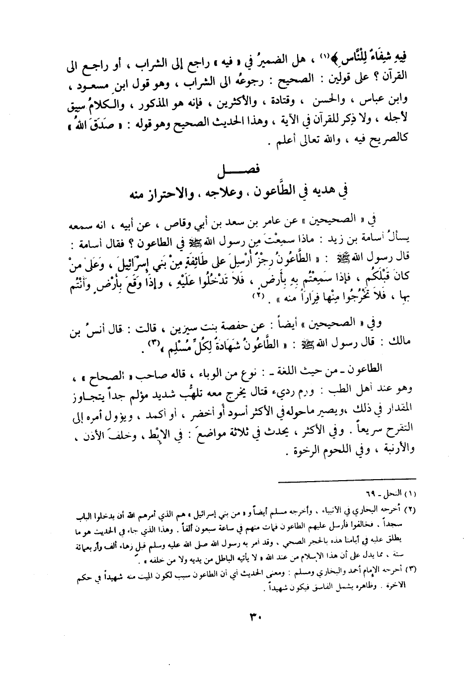 (3) أخرجه الإمام أحمد والبخاري ومسلم: ومعنى الحديث أي أن الطاعون سبب لكون الميت منه شهيدا في حكم الآخرة. وظاهره يشمل الفاسق فيكون شهيدا.