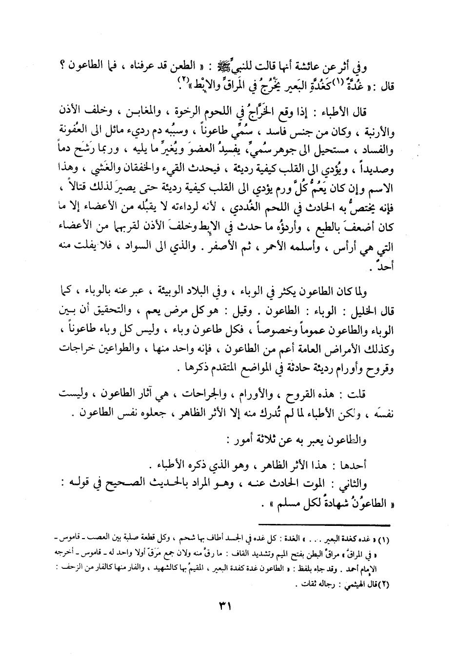 قُلْتُ: هَذِهِ الْقُرُوحُ، وَالْأَوْرَامُ، وَالْجِرَاحَاتُ، هِيَ آثَارُ الطَّاعُونِ، وَلَيْسَتْ نَفْسَهُ، وَلَكِنَّ الْأَطِبَّاءَ لَمَّا لَمْ تُدْرِكْ مِنْهُ إِلَّا الْأَثَرَ الظَّاهِرَ، جَعَلُوهُ نَفْسَ الطَّاعُونِ.