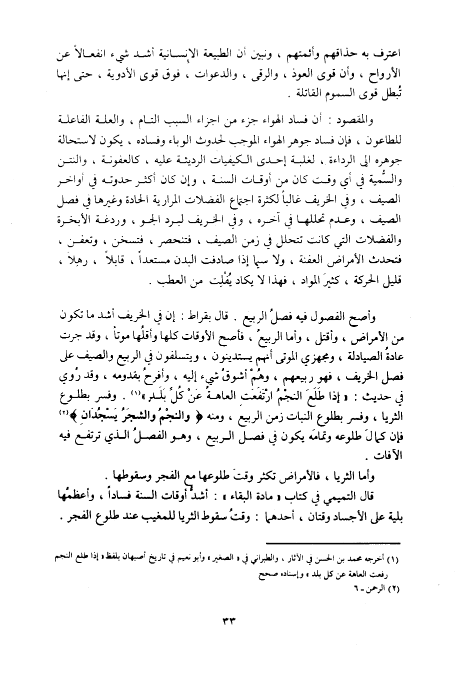 وأصح الفصول فيه فصل الربيع. قال بقراط: إِنَّ فِي الْخَرِيفِ أَشَدَّ مَا تَكُونُ مِنَ الْأَمْرَاضِ، وَأَقْتَلَ، وَأَمَّا الرَّبِيعُ، فَأَصَحُّ الْأَوْقَاتِ كُلِّهَا وَأَقَلُّهَا مَوْتًا، وَقَدْ جَرَتْ عَادَةُ الصَّيَادِلَةِ، وَمُجَهِّزِي الْمَوْتَى أَنَّهُمْ يَسْتَدِينُونَ، وَيَتَسَلَّفُونَ فِي الرَّبِيعِ وَالصَّيْفِ عَلَى فَصْلِ الْخَرِيفِ، فَهُوَ رَبِيعُهُمْ، وَهُمْ أَشْوَقُ شَيْءٍ إِلَيْهِ، وَأَفْرَحُ بِقُدُومِهِ، وَقَدْ رُوِيَ فِي حَدِيثِ: «إِذَا طَلَعَ النَّجْمُ ارْتَفَعَتِ الْعَاهَةُ عَنْ كُلِّ بَلَدٍ» «1» . وَفُسِّرَ بِطُلُوعِ الثُّرَيَّا، وَفُسِّرَ بِطُلُوعِ النَّبَاتِ زَمَنَ الرَّبِيعِ، وَمِنْهُ وَالنَّجْمُ وَالشَّجَرُ يَسْجُدانِ «2» فَإِنَّ كَمَالَ طُلُوعِهِ وَتَمَامَهُ يَكُونُ فِي فَصْلِ الرَّبِيعِ، وَهُوَ الْفَصْلُ الَّذِي تَرْتَفِعُ فِيهِ الْآفَاتُ.