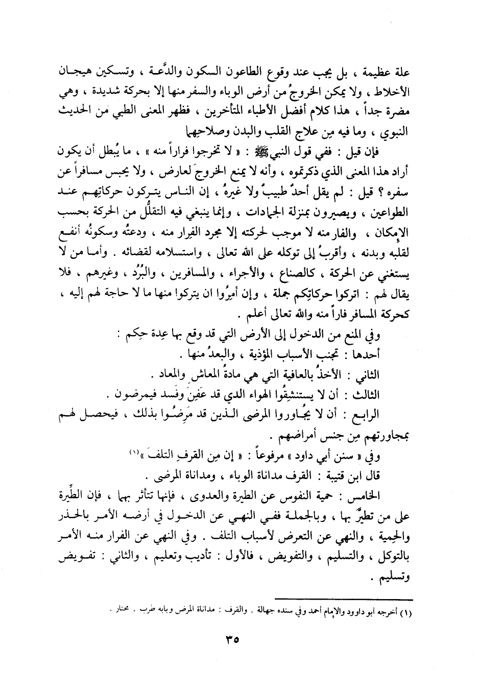عِلَّةً عَظِيمَةً، بَلْ يَجِبُ عِنْدَ وُقُوعِ الطَّاعُونِ السُّكُونُ وَالدَّعَةُ، وَتَسْكِينُ هَيَجَانِ الْأَخْلَاطِ، وَلَا يُمْكِنُ الْخُرُوجُ مِنْ أَرْضِ الْوَبَاءِ وَالسَّفَرُ مِنْهَا إِلَّا بِحَرَكَةٍ شَدِيدَةٍ، وَهِيَ مُضِرَّةٌ جِدًّا، هَذَا كَلَامُ أَفْضَلِ الْأَطِبَّاءِ الْمُتَأَخِّرِينَ، فَظَهَرَ الْمَعْنَى الطِّبِّيُّ مِنَ الْحَدِيثِ النَّبَوِيِّ، وَمَا فِيهِ مِنْ عِلَاجِ الْقَلْبِ وَالْبَدَنِ وَصَلَاحِهِمَا