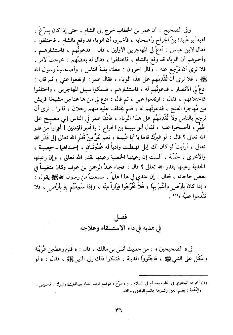 (1) أخرجه البخاري في الطب ومسلم في السلام. و «سرغ» موضع قرب الشام بين المغيشة وتبوك. قاموس. والعدوة: بضم العين وكسرها جانب الوادي وحافتاه.