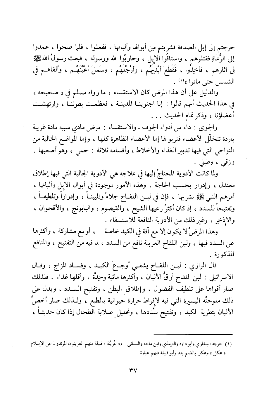 وَلَمَّا كَانَتِ الْأَدْوِيَةُ الْمُحْتَاجُ إِلَيْهَا فِي عِلَاجِهِ هِيَ الْأَدْوِيَةُ الْجَالِبَةُ الَّتِي فِيهَا إطْلَاقٌ مُعْتَدِلٌ، وَإِدْرَارٌ بِحَسْبِ الْحَاجَةِ، وَهَذِهِ الْأُمُورُ مَوْجُودَةٌ فِي أَبْوَالِ الْإِبِلِ وَأَلْبَانِهَا، أَمَرَهُمُ النَّبِيُّ صَلَّى اللَّهُ عَلَيْهِ وَسَلَّمَ بِشُرْبِهَا، فَإِنَّ فِي لَبَنِ اللِّقَاحِ جَلَاءً وَتَلْيِينًا، وَإِدْرَارًا وَتَلْطِيفًا، وَتَفْتِيحًا لِلسُّدَدِ، إِذْ كَانَ أَكْثَرُ رَعْيِهَا الشِّيحَ، وَالْقَيْصُومَ، وَالْبَابُونَجَ، وَالْأُقْحُوَانَ، وَالْإِذْخِرَ، وَغَيْرَ ذَلِكَ مِنَ الْأَدْوِيَةِ النَّافِعَةِ لِلِاسْتِسْقَاءِ.