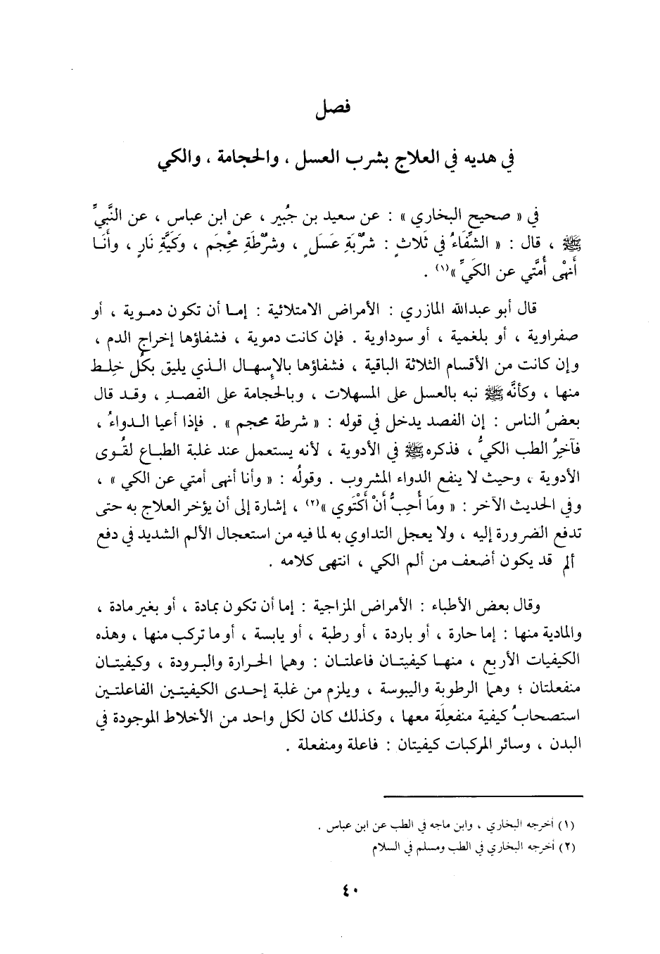 قَالَ أَبُو عَبْدِ اللَّهِ الْمَازِرِيُّ: الْأَمْرَاضُ الِامْتِلَائِيَّةُ: إِمَّا أَنْ تَكُونَ دَمَوِيَّةً، أَوْ صَفْرَاوِيَّةً، أَوْ بَلْغَمِيَّةً، أَوْ سَوْدَاوِيَّةً. فَإِنْ كَانَتْ دَمَوِيَّةً، فَشِفَاؤُهَا إِخْرَاجُ الدَّمِ، وَإِنْ كَانَتْ مِنَ الْأَقْسَامِ الثَّلَاثَةِ الْبَاقِيَةِ، فَشِفَاؤُهَا بِالْإِسْهَالِ الَّذِي يَلِيقُ بِكُلِّ خَلْطٍ مِنْهَا، وَكَأَنَّهُ صَلَّى اللَّهُ عَلَيْهِ وَسَلَّمَ نَبَّهَ بِالْعَسَلِ عَلَى الْمُسَهِّلَاتِ، وَبِالْحِجَامَةِ عَلَى الْفَصْدِ، وَقَدْ قَالَ بَعْضُ النَّاسِ: إِنَّ الْفَصْدَ يَدْخُلُ فِي قَوْلِهِ: «شَرْطَةِ مِحْجَمٍ» . فَإِذَا أَعْيَا الدَّوَاءُ، فَآخِرُ الطِّبِّ الْكَيُّ، فَذَكَرَهُ صَلَّى اللَّهُ عَلَيْهِ وَسَلَّمَ فِي الْأَدْوِيَةِ، لِأَنَّهُ يُسْتَعْمَلُ عِنْدَ غَلَبَةِ الطِّبَاعِ لِقُوَى الْأَدْوِيَةِ، وَحَيْثُ لَا يَنْفَعُ الدَّوَاءُ الْمَشْرُوبُ. وَقَوْلُهُ: «وَأَنَا أَنْهَى أُمَّتِي عَنِ الْكَيِّ» ، وَفِي الْحَدِيثِ الْآخَرِ: «وَمَا أُحِبُّ أَنْ أَكْتَوِيَ» «2» ، إِشَارَةٌ إِلَى أَنْ يُؤَخَّرَ الْعِلَاجُ بِهِ حَتَّى تَدْفَعَ الضَّرُورَةُ إِلَيْهِ، وَلَا يُعَجَّلُ التَّدَاوِي بِهِ لِمَا فِيهِ مِنَ اسْتِعْجَالِ الْأَلَمِ الشَّدِيدِ فِي دَفْعِ أَلَمٍ قَدْ يَكُونُ أَضْعَفَ مِنْ أَلَمِ الْكَيِّ، انْتَهَى كَلَامُهُ.