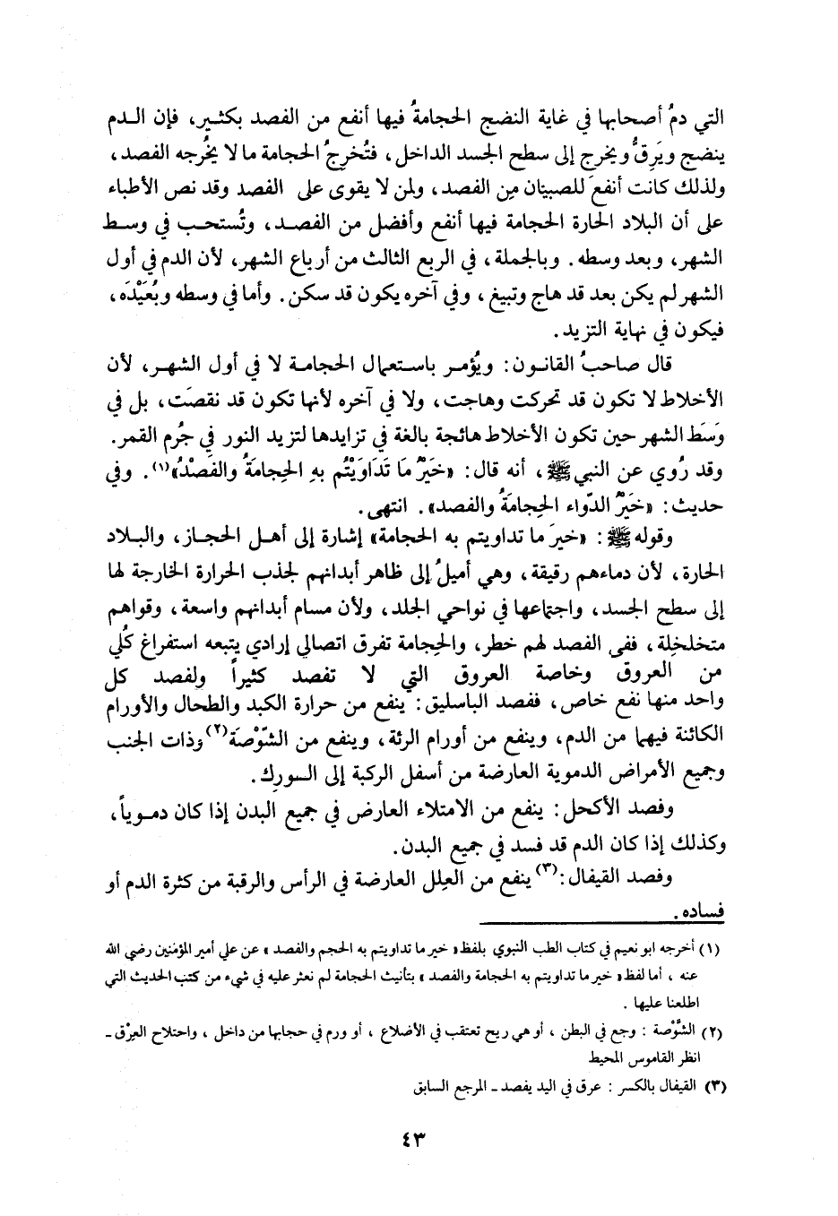 (1) أخرجه ابو نعيم في كتاب الطب النبوي بلفظ «خير ما تداويتم به الحجم والفصد» عن علي أمير المؤمنين رضي الله عنه، أما لفظ «خير ما تداويتم به الحجامة والفصد» بتأنيث الحجامة لم نعثر عليه في شيء من كتب الحديث التي اطلعنا عليها.