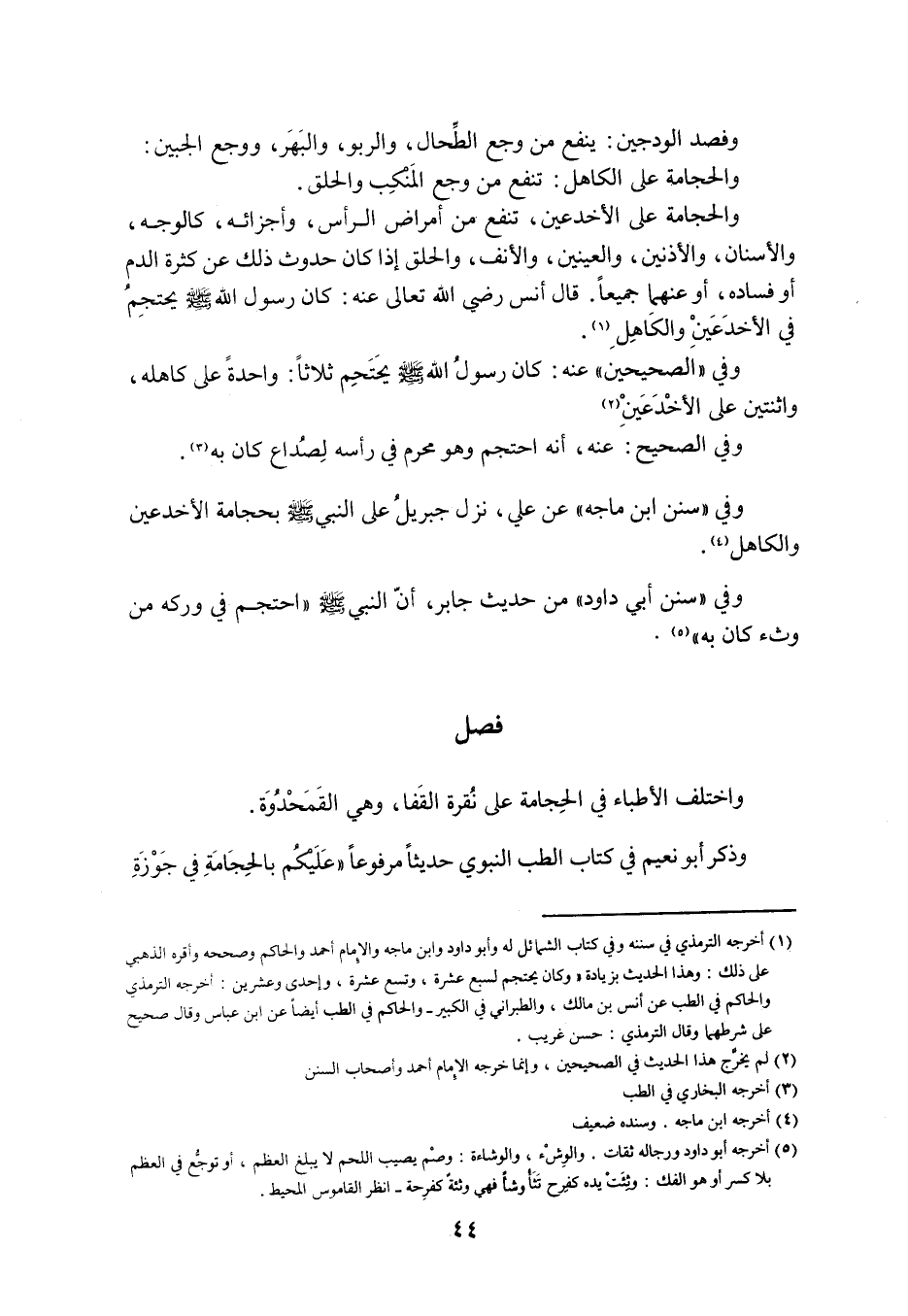 (1) أخرجه الترمذي في سننه وفي كتاب الشمائل له وأبو داود وابن ماجه والإمام أحمد والحاكم وصححه وأقره الذهبي على ذلك: وهذا الحديث بزيادة «وكان يحتجم لسبع عشرة، وتسع عشرة، وإحدى وعشرين: أخرجه الترمذي والحاكم في الطب عن أنس بن مالك، والطبراني في الكبير- والحاكم في الطب أيضا عن ابن عباس وقال صحيح على شرطهما وقال الترمذي: حسن غريب.