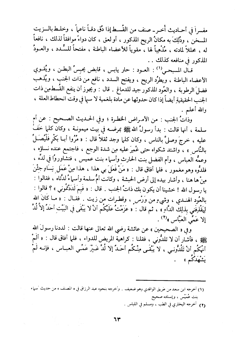 مُفَسَّرًا فِي أَحَادِيثَ أُخَرَ- صِنْفٌ مِنَ الْقُسْطِ إِذَا دُقَّ دَقًّا نَاعِمًا، وَخُلِطَ بِالزَّيْتِ الْمُسَخَّنِ، وَدُلِكَ بِهِ مَكَانُ الرِّيحِ الْمَذْكُورُ، أَوْ لُعِقَ، كَانَ دَوَاءً مُوَافِقًا لِذَلِكَ، نَافِعًا لَهُ، مُحَلِّلًا لِمَادَّتِهِ، مُذْهِبًا لَهَا، مُقَوِّيًا لِلْأَعْضَاءِ الْبَاطِنَةِ، مُفَتِّحًا لِلسُّدَدِ، وَالْعُودُ الْمَذْكُورُ فِي مَنَافِعِهِ كَذَلِكَ..