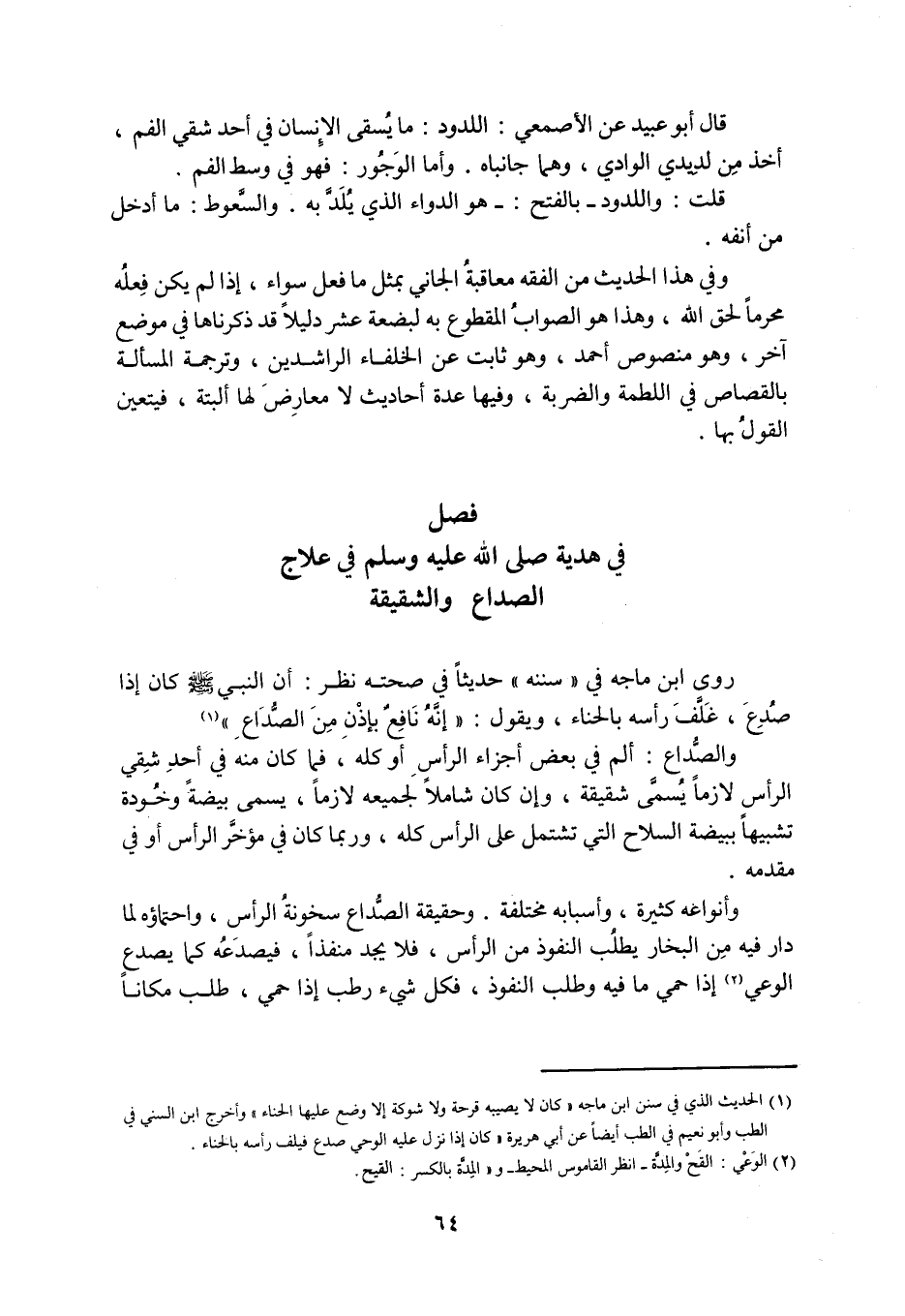 فَصْلٌ فِي هَدْيِهِ صَلَّى اللَّهُ عَلَيْهِ وَسَلَّمَ فِي عِلَاجِ الصُّدَاعِ وَالشَّقِيقَةِ