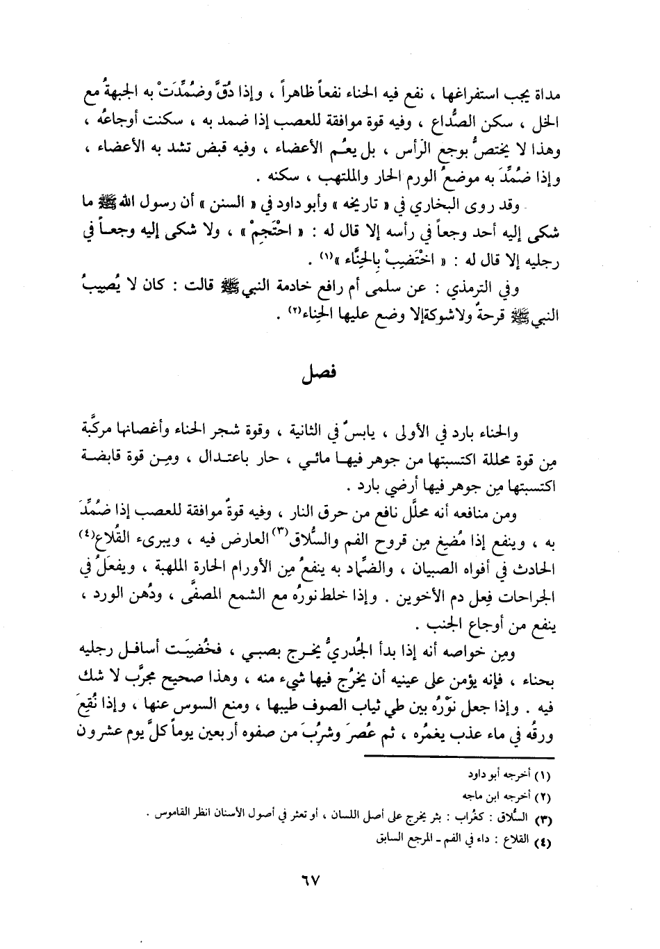 وَقَدْ رَوَى الْبُخَارِيُّ فِي «تَارِيخِهِ» وأبو داود فِي «السُّنَنِ» أَنَّ رسول الله صلى الله عليه وسلم ما شَكَى إِلَيْهِ أَحَدٌ وَجَعًا فِي رَأْسِهِ إِلَّا قَالَ لَهُ: «احْتَجِمْ» ، وَلَا شَكَى إِلَيْهِ وَجَعًا فِي رِجْلَيْهِ إِلَّا قَالَ لَهُ: «اخْتَضِبْ بِالْحِنَّاءِ» «1» .