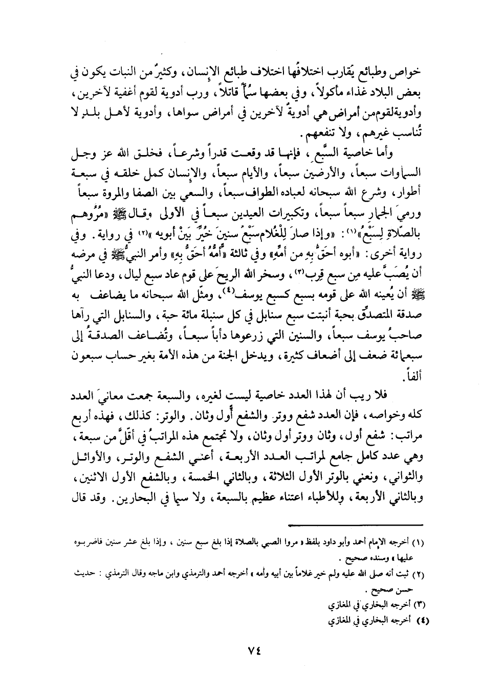 فَلَا رَيْبَ أَنَّ لِهَذَا الْعَدَدِ خَاصِّيَّةً لَيْسَتْ لِغَيْرِهِ، وَالسَّبْعَةُ جَمَعَتْ مَعَانِيَ الْعَدَدِ كُلِّهِ وَخَوَاصِّهُ، فَإِنَّ الْعَدَدَ شَفْعٌ وَوَتْرٌ وَالشَّفْعُ أَوَّلٌ وَثَانٍ. وَالْوَتْرُ: كَذَلِكَ، فَهَذِهِ أَرْبَعُ مَرَاتِبَ: شَفْعٌ أَوَّلٌ، وَثَانٍ وَوَتْرٌ أَوَّلٌ وَثَانٍ، وَلَا تَجْتَمِعُ هَذِهِ الْمَرَاتِبُ فِي أَقَلَّ مِنْ سَبْعَةٍ، وَهِيَ عَدَدٌ كَامِلٌ جَامِعٌ لِمَرَاتِبِ الْعَدَدِ الْأَرْبَعَةِ، أَعْنِي الشَّفْعَ وَالْوَتْرَ، وَالْأَوَائِلَ وَالثَّوَانِيَ، وَنَعْنِي بِالْوَتْرِ الْأَوَّلِ الثَّلَاثَةَ، وَبِالثَّانِي الْخَمْسَةَ، وَبِالشَّفْعِ الْأَوَّلِ الِاثْنَيْنِ، وَبِالثَّانِي الْأَرْبَعَةَ، وَلِلْأَطِبَّاءِ اعْتِنَاءٌ عَظِيمٌ بِالسَّبْعَةِ، وَلَا سِيَّمَا فِي البحارين. وقد قال
