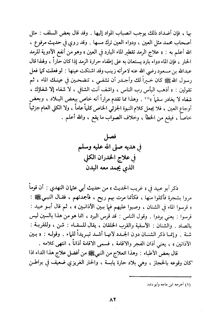 بِهَا، فَإِنَّ أَضْدَادَ ذَلِكَ يُوجِبُ انْصِبَابَ الْمَوَادِّ إِلَيْهَا. وَقَدْ قَالَ بَعْضُ السَّلَفِ: مَثَلُ أَصْحَابِ مُحَمَّدٍ مَثَلُ الْعَيْنِ، وَدَوَاءُ الْعَيْنِ تَرْكُ مَسِّهَا. وَقَدْ رُوِيَ فِي حَدِيثٍ مَرْفُوعٍ، اللَّهُ أَعْلَمُ بِهِ: «عِلَاجُ الرَّمَدِ تَقْطِيرُ الْمَاءِ الْبَارِدِ فِي الْعَيْنِ» وَهُوَ مِنْ أَنْفَعِ الْأَدْوِيَةِ لِلرَّمَدِ الْحَارِّ، فَإِنَّ الْمَاءَ دَوَاءٌ بَارِدٌ يُسْتَعَانُ بِهِ عَلَى إِطْفَاءِ حَرَارَةِ الرَّمَدِ إِذَا كَانَ حَارًّا، وَلِهَذَا قَالَ عَبْدُ اللَّهِ بْنُ مَسْعُودٍ رَضِيَ اللَّهُ عَنْهُ لِامْرَأَتِهِ زينب وَقَدِ اشْتَكَتْ عَيْنُهَا: لَوْ فَعَلْتِ كَمَا فَعَلَ رَسُولُ اللَّهِ صَلَّى اللَّهُ عَلَيْهِ وَسَلَّمَ كَانَ خَيْرًا لَكِ وَأَجْدَرَ أَنْ تُشْفِي، تَنْضَحِينَ فِي عَيْنِكِ الْمَاءَ، ثُمَّ تَقُولِينَ: «أَذْهِبِ الْبَأْسَ رَبَّ النَّاسِ، وَاشْفِ أَنْتَ الشَّافِي، لَا شِفَاءَ إِلَّا شِفَاؤُكَ، شِفَاءً لَا يُغَادِرُ سَقَمًا» «1» . وَهَذَا مِمَّا تَقَدَّمَ مِرَارًا أَنَّهُ خَاصٌّ بِبَعْضِ الْبِلَادِ، وَبَعْضِ أَوْجَاعِ الْعَيْنِ، فَلَا يُجْعَلُ كَلَامُ النُّبُوَّةِ الْجُزْئِيُّ الْخَاصُّ كُلِّيًّا عَامًّا، وَلَا الْكُلِّيُّ الْعَامُّ جُزْئِيًّا خَاصًّا، فَيَقَعُ مِنَ الْخَطَأِ، وَخِلَافُ الصَّوَابِ مَا يَقَعُ، وَاللَّهُ أَعْلَمُ.