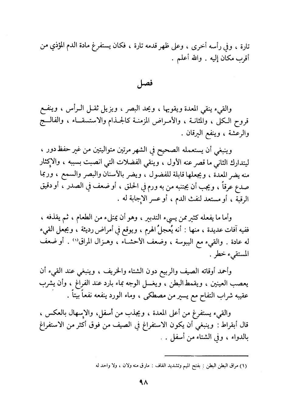 وَأَمَّا مَا يَفْعَلُهُ كَثِيرٌ مِمَّنْ يُسِيءُ التَّدْبِيرَ، وَهُوَ أَنْ يمتلىء مِنَ الطَّعَامِ، ثُمَّ يَقْذِفُهُ، فَفِيهِ آفَاتٌ عَدِيدَةٌ، مِنْهَا: أَنَّهُ يُعَجِّلُ الْهَرَمَ، وَيُوقِعُ فِي أَمْرَاضٍ رَدِيئَةٍ، وَيَجْعَلُ الْقَيْءَ لَهُ عَادَةً. وَالْقَيْءُ مَعَ الْيُبُوسَةِ، وَضَعْفِ الْأَحْشَاءِ، وَهُزَالِ الْمَرَاقِّ «1» . أَوْ ضَعْفِ الْمُسْتَقِيءِ خَطَرٌ.