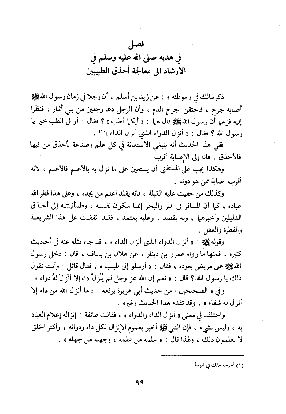 ذَكَرَ مالك فِي «مُوَطَّئِهِ» : عَنْ زَيْدِ بْنِ أَسْلَمَ، أَنَّ رَجُلًا فِي زَمَانِ رَسُولِ اللَّهِ صَلَّى اللَّهُ عَلَيْهِ وَسَلَّمَ أَصَابَهُ جُرْحٌ، فَاحْتَقَنَ الْجُرْحُ الدَّمَ، وَأَنَّ الرَّجُلَ دَعَا رَجُلَيْنِ مِنْ بَنِي أَنْمَارَ، فَنَظَرَا إِلَيْهِ فَزَعَمَا أَنَّ رَسُولَ اللَّهِ صَلَّى اللَّهُ عَلَيْهِ وَسَلَّمَ قَالَ لَهُمَا: «أَيُّكُمَا أَطَبُّ» ؟ فَقَالَ: أَوَ فِي الطِّبِّ خَيْرٌ يَا رَسُولَ اللَّهِ؟ فَقَالَ: «أَنْزَلَ الدَّوَاءَ الَّذِي أَنْزَلَ الدَّاءَ» «1» .