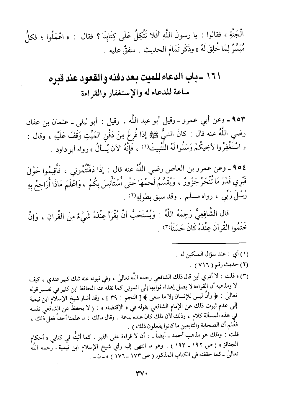 قلت: لا أدري أين قال ذلك الشافعي C تعالى وفي ثبوته عنه شك كبير عندي كيف لا ومذهبه أن القراءة لا يصل إهداء ثوابها إلى الموتى كما نقله عنه الحافظ ابن كثير في تفسير قوله تعالى: (وأن ليس للإنسان إلا ما سعى) وقد أشار شيخ الإسلام ابن تيمية إلى عدم ثبوت ذلك عن الإمام الشافعي بقوله في (الإقتضاء) : (لا يحفظ عن الشافعي نفشه في هذه المسألة كلام وذلك لأن ذلك كان عنده بدعة وقال مالك: ما علمنا أحدا فعل ذلك فعلم أن الصحابة والتابعين ما كانوا يفعلون ذلك)