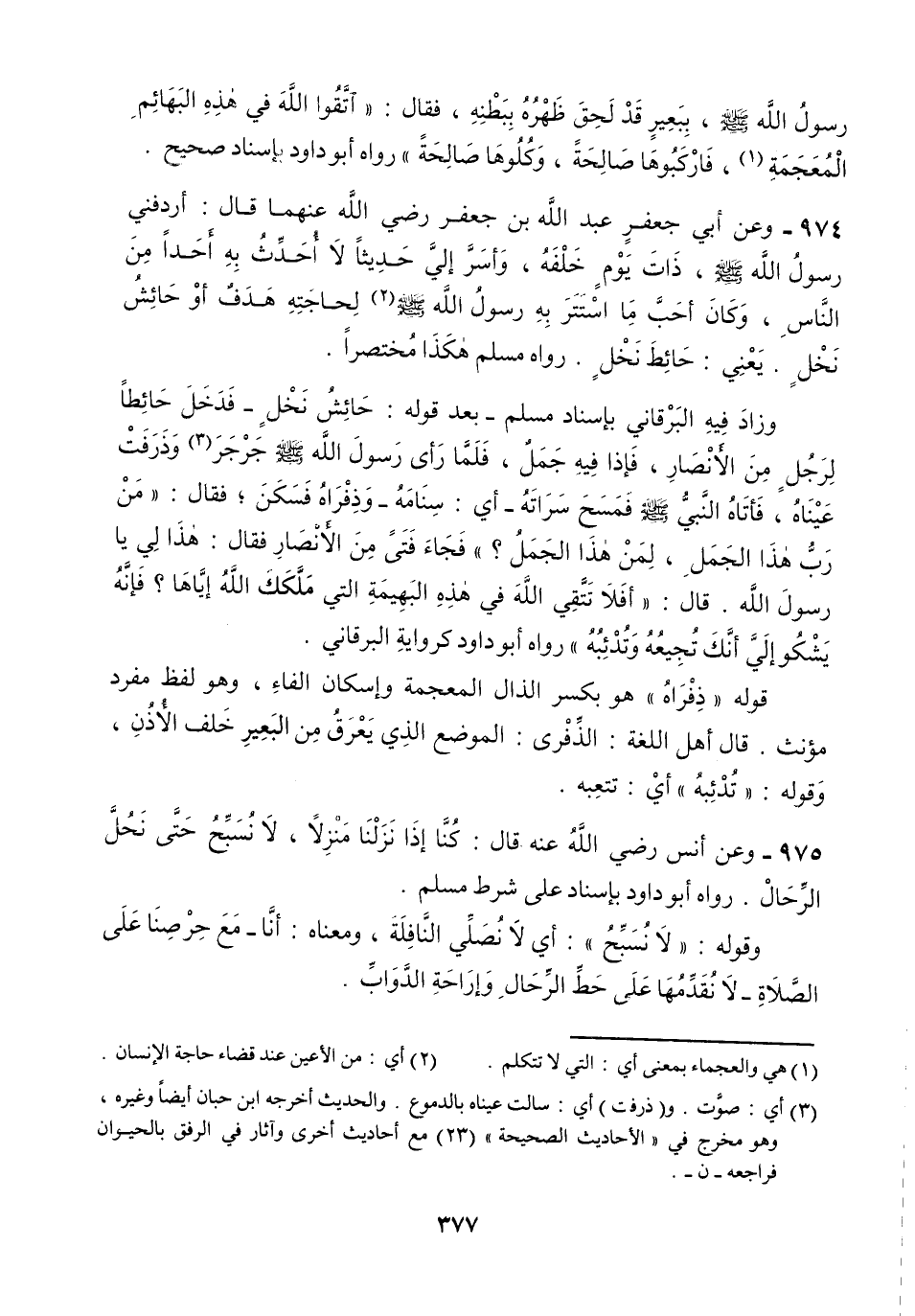 وزاد فيه البرقاني بإسناد مسلم - بعد قوله: حائش نخل - فدخل حائطا لرجل من الأنصار فإذا فيه جمل فلما رأى رسول الله A جرجر وذرفت عيناه فأتاه النبي A فمسح سراته - أي سنامه - وذفراه فسكن فقال: " من كان رب هذا الجمل لمن هذا الجمل؟ فجاء فتى من الأنصار فقال: هذا لي يا رسول الله قال: " ألا تتقى الله في هذه البهيمة التي ملكك الله إياها؟ فإنه يشكو إلي أنك تجيعه وتدئبه " رواه أبو داود كرواية البرقاني