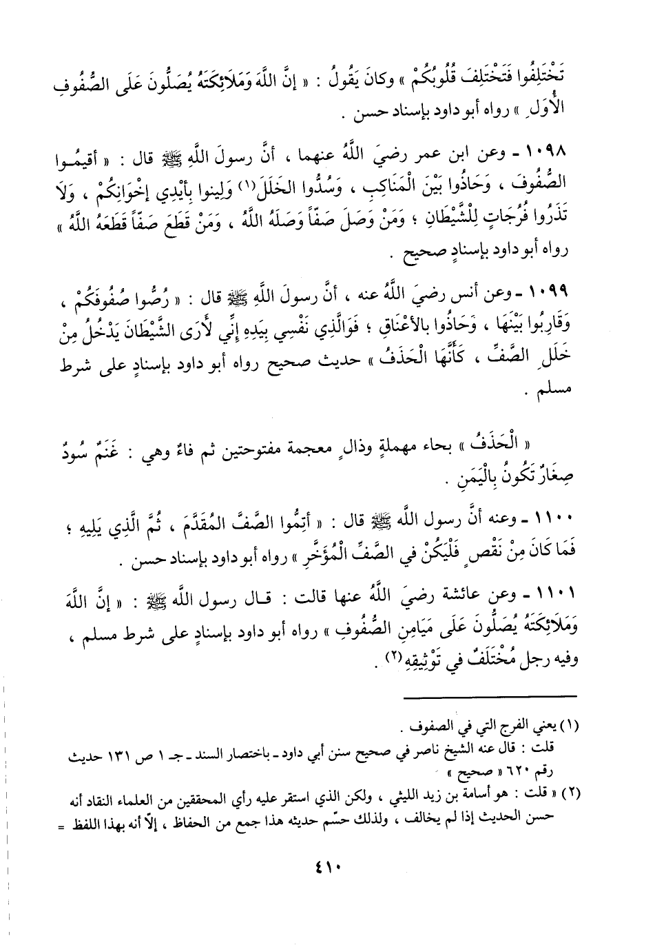 عن عائشة Bها قات: قال رسول الله A: " إن الله وملائكته يصلون على ميامن الصفوف " رواه أبو داود بإسناد على شرط مسلم وفيه رجل مختلف في توثيقه