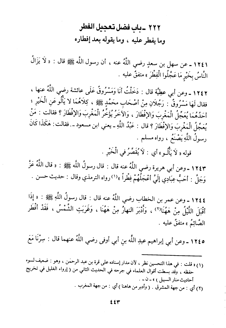 عن أبي هريرة Bهـ قال: قال رسول الله A: " قال الله D: أحب عبادي إلي أعجلهم فطرا " رواه الترمذي وقال: حديث حسن