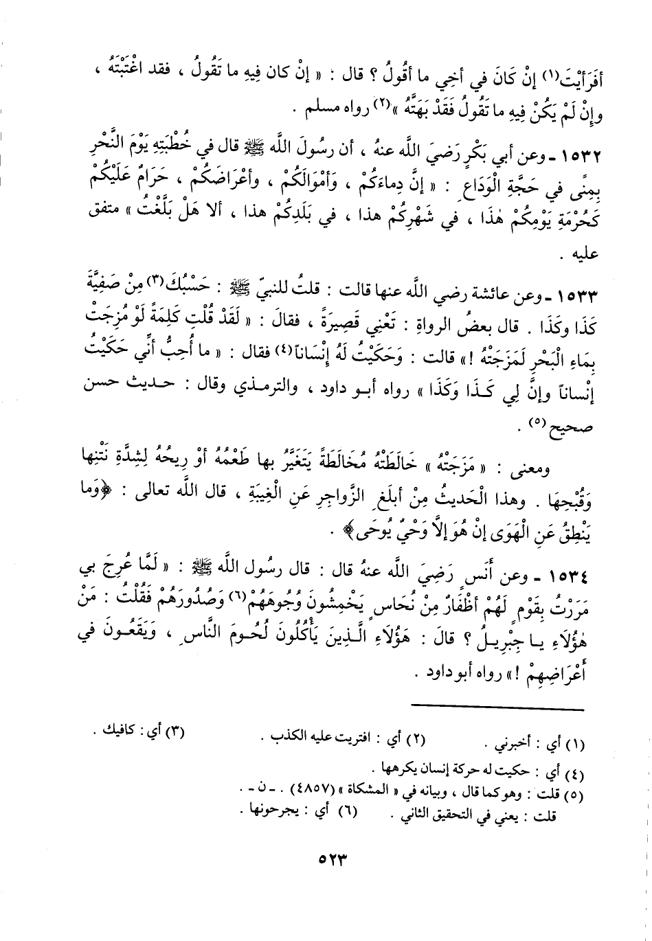 عن عائشة Bها قالت: قلت للنبي A: حسبك من صفية كذا وكذا. قال بعض الرواة: تعني قصيرة فقال: " لقد قلت كلمة لو مزجت بماء البحر لمزجته " قالت: وحكيت له إنسانا فقال: " ما أحب أني حكيت إنسانا وإن لي كذا وكذا " رواه أبو داود الترمذي وقال: حديث حسن صحيح