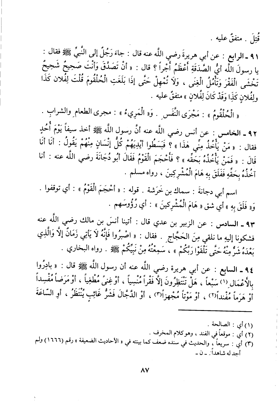 عن أبي هريرة Bهـ أن رسول الله A قال: " بادروا بالأعمال سبعا هل تنتظرون إلا فقرا منسيا أو غنى مطغيا أو مرضا مفسدا أو هرما مفندا أو موتا مجهزا أو الدجال فشر غائب ينتظر أو الساعة فالساعة أدهى وأمر " رواه الترمذي وقال: حديث حسن