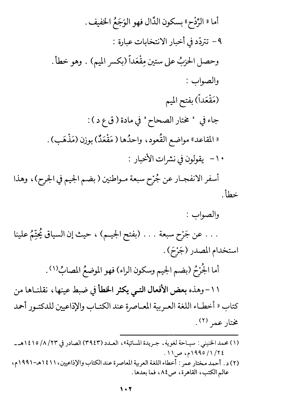 2- د. أحمد مختار عمر، أخطاء اللغة العربية المعاصرة عند الكتاب والإذاعيين،1411هـ ـ 1991م، عالم الكتب، القاهرة، ص84 فما بعدها.