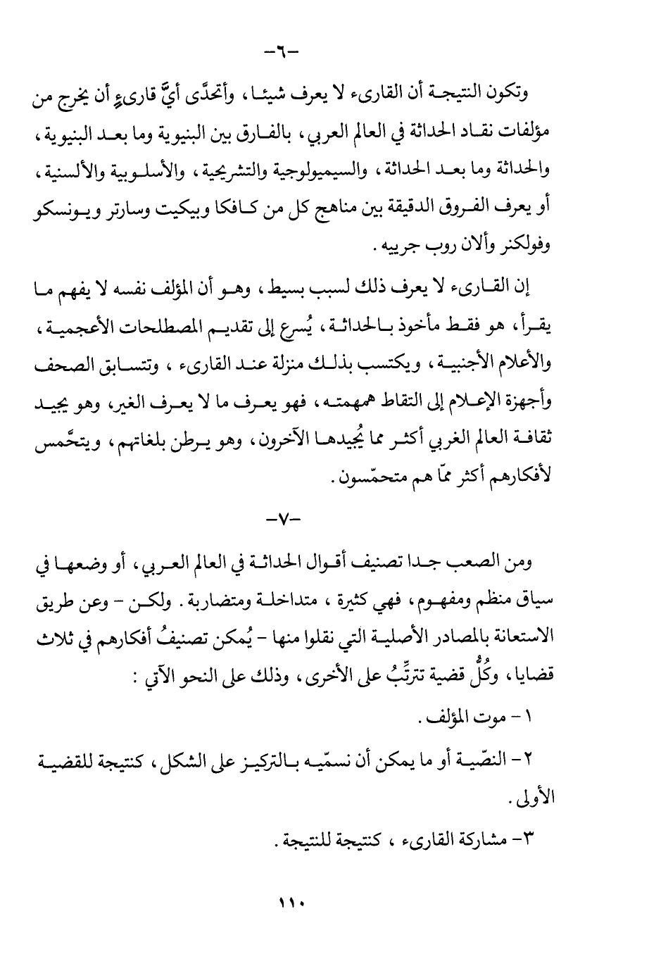 وتكون النتيجة أن القارئ لا يعرف شيئًا، وأتحدى أي قارئ أن يخرج من مؤلفات نقاد الحداثة في العالم العربي، بالفارق بين البنيوية وما بعد البنيوية، والحداثة وما بعد الحداثة، والسيميولوجية والتشريحية، والأسلوبية والألسنية، أو يعرف الفروق الدقيقة بين مناهج كل من كافكا وبيكيت وسارتر ويونسكو وفولكنر وألان روب جرييه.