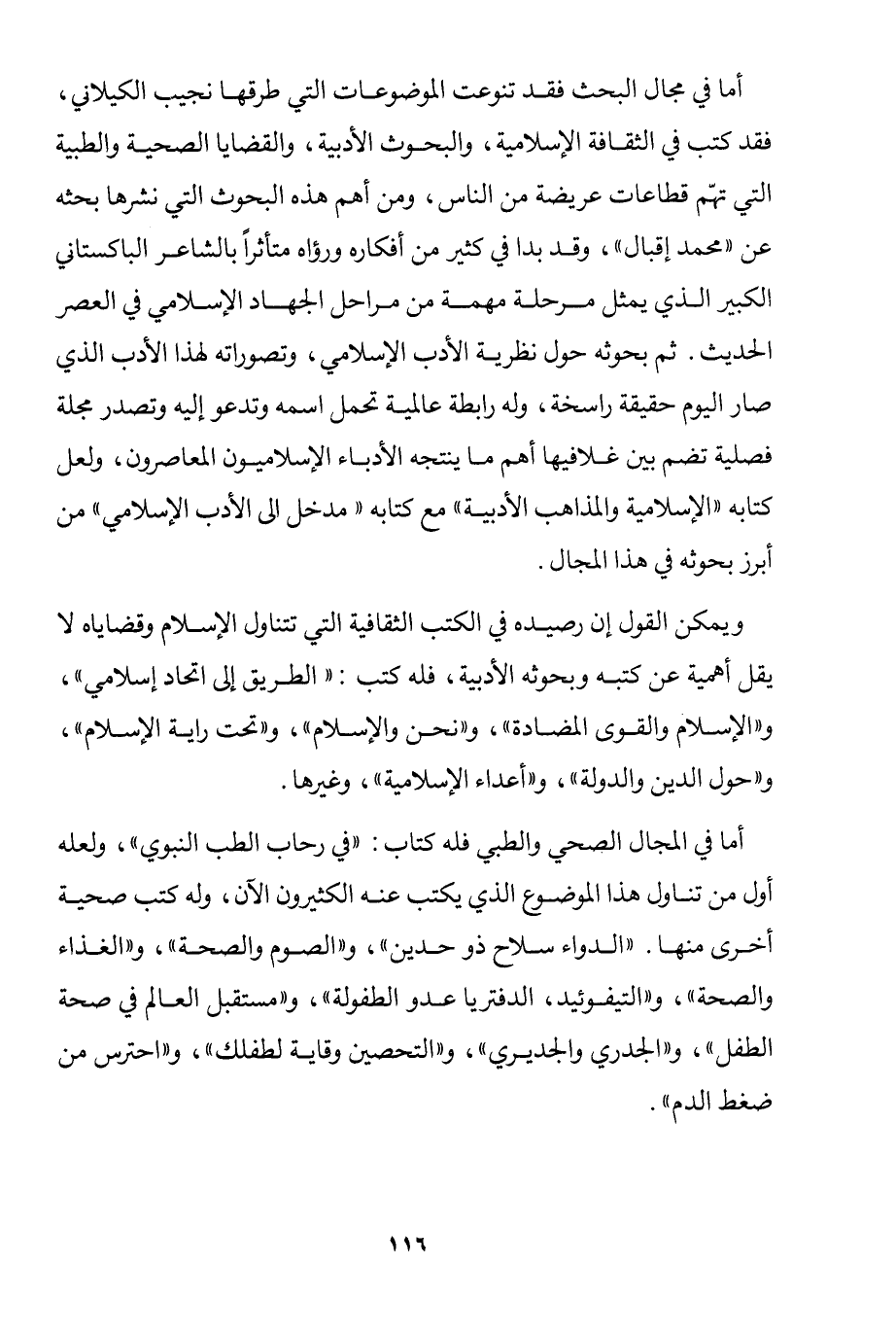 أما في مجال البحث فقد تنوعت الموضوعات التي طرقها نجيب الكيلاني، فقد كتب في الثقافة الإسلامية، والبحوث الأدبية والقضايا الصحية والطبية التي تهم قطاعات عريضة من الناس، ومن أهم هذه البحوث التي نشرها بحثه عن "محمد إقبال" وقد بدا في كثير من أفكاره ورؤاه متأثرا بالشاعر الباكستاني الكبير الذي يمثل مرحلة مهمة من مراحل الجهاد الإسلامي في العصر الحديث. ثم بحوثه حول نظرية الأدب الإسلامي، وتصوراته لهذا الأدب الذي صار اليوم حقيقة راسخة، وله رابطة عالمية تحمل اسمه وتدعو إليه، وتصدر مجلة فصلية تضم بين غلافيها أهم ما ينتجه الأدباء الإسلاميون المعاصرون، ولعل كتابه "الإسلامية والمذاهب الأدبية" مع كتابه "مدخل إلى الأدب الإسلامي" من أبرز بحوثه في هذا المجال.