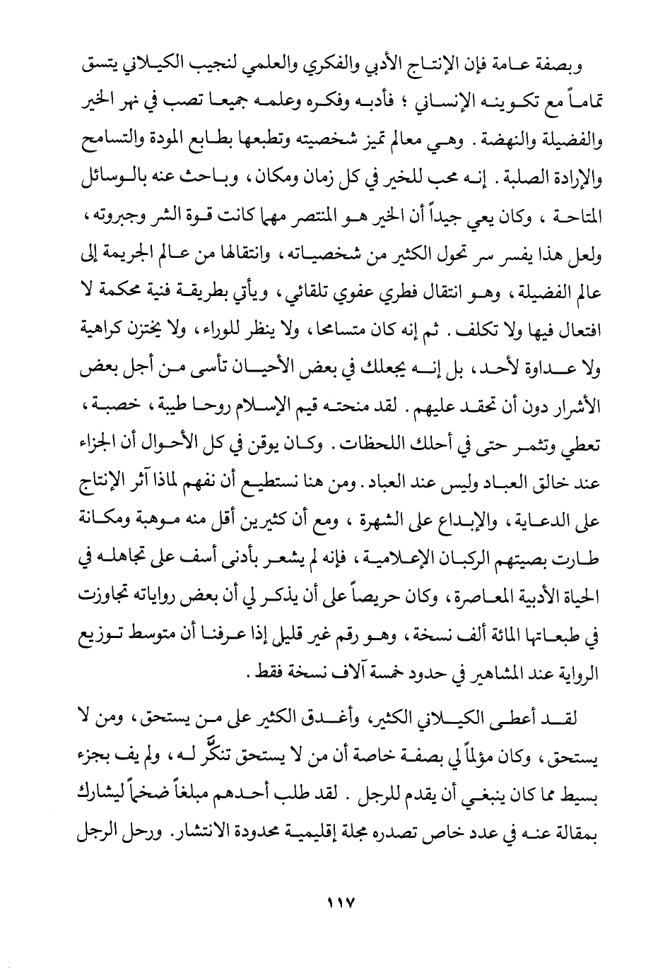 وبصفة عامة: فإن الإنتاج الأدبي والفكري والعلمي لنجيب الكيلاني يتسق تمامًا مع تكوينه الإنساني؛ فأدبه وفكره وعلمه جميعًا تصب في نهر الخير والفضيلة والنهضة. وهي معالم تميز شخصيته وتطبعها بطابع المودة والتسامح والإرادة الصلبة. إنه محب للخير في كل زمان ومكان، وباحث عنه بالوسائل المتاحة، وكان يعي جيدًا أن الخير هو المنتصر مهما كانت قوة الشر وجبروته، ولعل هذا يفسر سر تحول الكثير من شخصياته، وانتقالها من عالم الجريمة إلى عالم الفضيلة، وهو انتقال فطري عفوي تلقائي، ويأتي بطريقة فنية محكمة لا افتعال فيها ولا تكلف. ثم إنه كان متسامحًا، ولا ينظر للوراء، ولا يختزن كراهية ولا عداوة لأحد، بل إنه يجعلك في بعض الأحيان تأسى من أجل بعض الأشرار دون أن تحقد عليهم، لقد منحته قيم الإسلام روحًا طيبة، خصبة، تعطي وتثمر حتى في أحلك اللحظات. وكان يوقن في كل الأحوال أن الجزاء عند خالق العباد وليس عند العباد. ومن هنا نستطيع أن نفهم لماذا آثر الإنتاج على الدعاية، والإبداع على الشهرة، ومع أن كثيرين أقل منه موهبة ومكانة طارت بصيتهم الركبان الإعلامية، فإنه لم يشعر بأدنى أسف على تجاهله في الحياة الأدبية المعاصرة، وكان حريصًا على أن يذكر لي أن بعض رواياته تجاوزت في طبعاتها المائة ألف نسخة، وهو رقم غير قليل إذا عرفنا أن متوسط توزيع الرواية عند المشاهير في حدود خمسة آلاف نسخة فقط.