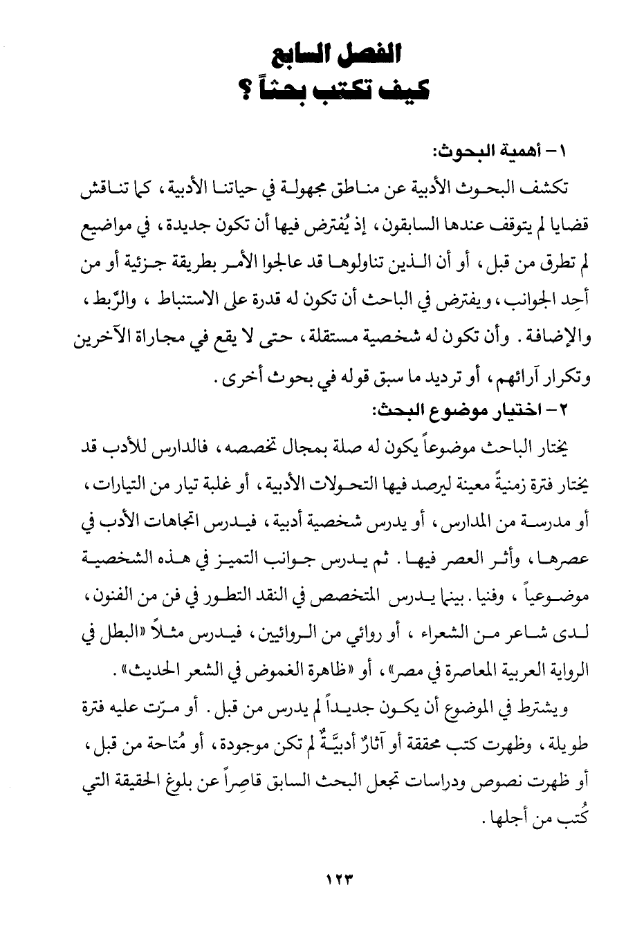 ويشترط في الموضوع أن يكون جديدًا لم يدرس من قبل. أو مرت عليه فترة طويلة، وظهرت كتب محققة أو آثار أدبية لم تكن موجودة، أو متاحة من قبل، وظهرت نصوص ودراسات تجعل البحث السابق قاصرًا عن بلوغ الحقيقة التي كتب من أجلها.