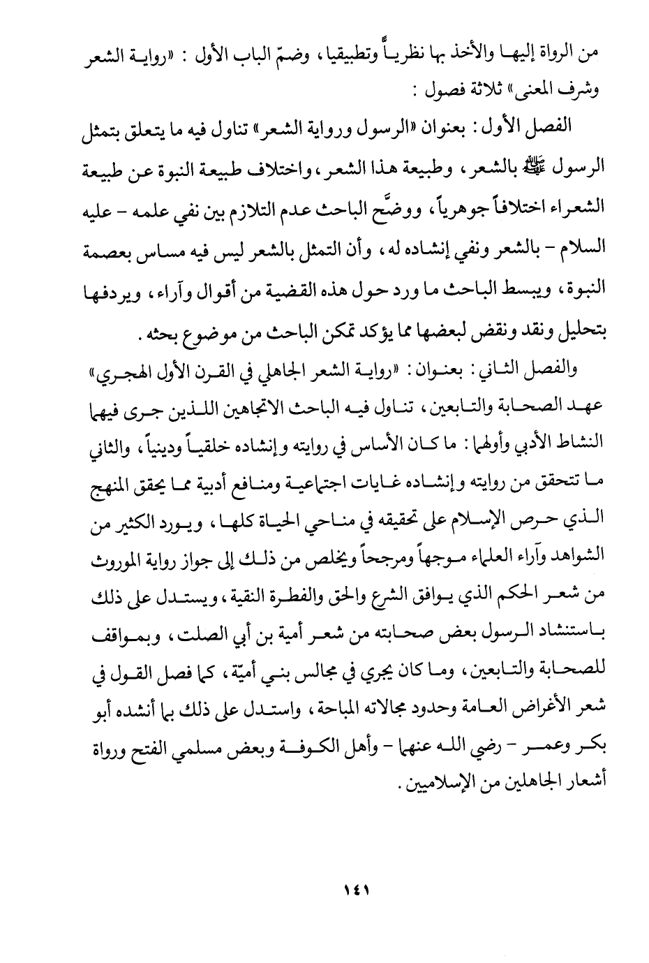 الفصل الأول: بعنوان "الرسول ورواية الشعر" تناول فيه ما يتعلق بتمثل الرسول صلى الله عليه وسلم بالشعر، وطبيعة هذا الشعر، واختلاف طبيعة النبوة عن طبيعة الشعراء اختلافا جوهريا، ووضح الباحث عدم التلازم بين نفي علمه، عليه السلام، بالشعر ونفي إنشاده له، وأن التمثل بالشعر ليس فيه مساس بعصمة النبوة، ويبسط الباحث ما ورد حول هذه القضية من أقوال وآراء ويردفها بتحليل ونقد لبعضها؛ مما يؤكد تمكن الباحث من موضوع بحثه.