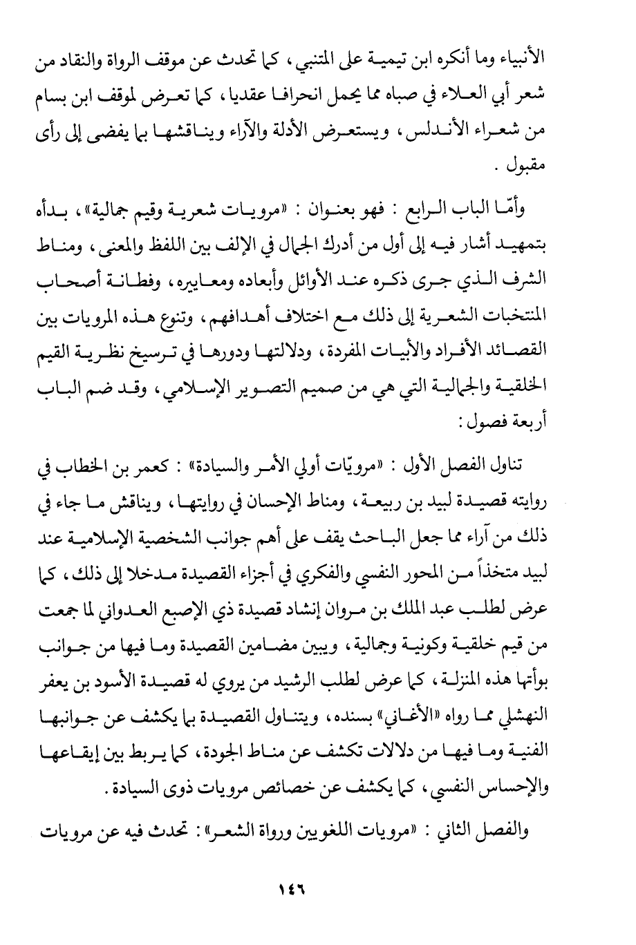 الأنبياء وما أنكره ابن تيمية على المتنبي، كما تحدث عن موقف الرواة والنقاد من شعر أبي العلاء في صباه مما يحمل انحرافا عقديا، كما تعرض لموقف ابن بسام من شعراء الأندلس، ويستعرض الأدلة والآراء ويناقشها بما يفضي إلى رأي مقبول.