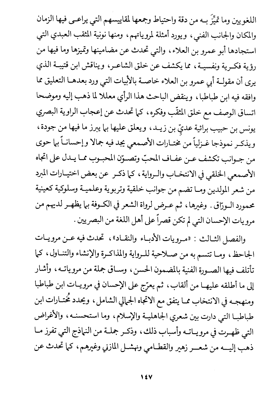 والفصل الثالث: "مرويات الأدباء والنقاد"، تحدث فيه عن مرويات الجاحظ، وما تتسم به من صلاحية للرواية والمذاكرة والإنشاء والتناول، كما تأتلف فيها الصورة الفنية بالمضمون الحسن، وساق جملة من مروياته، وأشار إلى ما أطلقه عليها من ألقاب، ثم يعرج على الإحسان في مرويات ابن طباطبا ومنهجه في الانتخاب مما يتفق مع الاتجاه الجمالي الشامل، ويحدد مختارات ابن طباطبا التي دارت بين شعري الجاهلية والإسلام، وما استحسنه، والأغراض التي ظهرت في مروياته وأسباب ذلك، وذكر جملة من النماذج التي تفرز ما ذهب إليه من شعر زهير والقطامي ونهشل المازني وغيرهم، كما تحدث عن