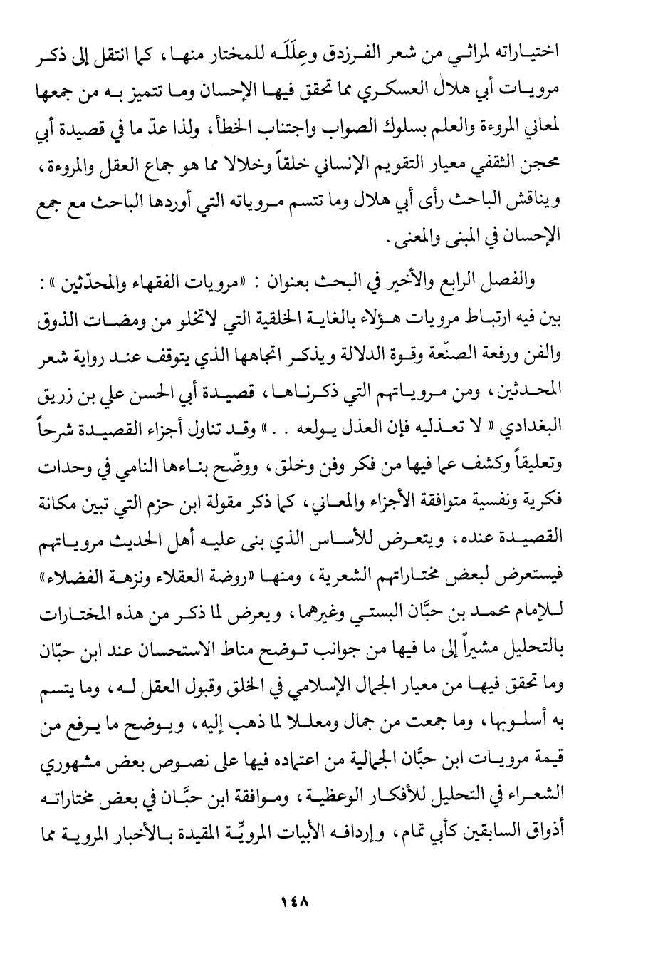 اختياراته لمراثي من شعر الفرزدق وعلله للمختار منها، كما انتقل إلى ذكر مرويات أبي هلال العسكري مما تحقق فيها الإحسان وما تتميز به من جمعها لمعاني المروءة والعلم بسلوك الصواب واجتناب الخطأ، ولذا عد في قصيدة أبي محجن الثقفي معيار التقويم الإنساني خلقًا وخلالا مما هو جماع العقل والمروءة، ويناقش الباحث رأي أبي هلال وما تتسم مروياته التي أوردها الباحث مع جمع الإحسان في المبنى والمعنى.