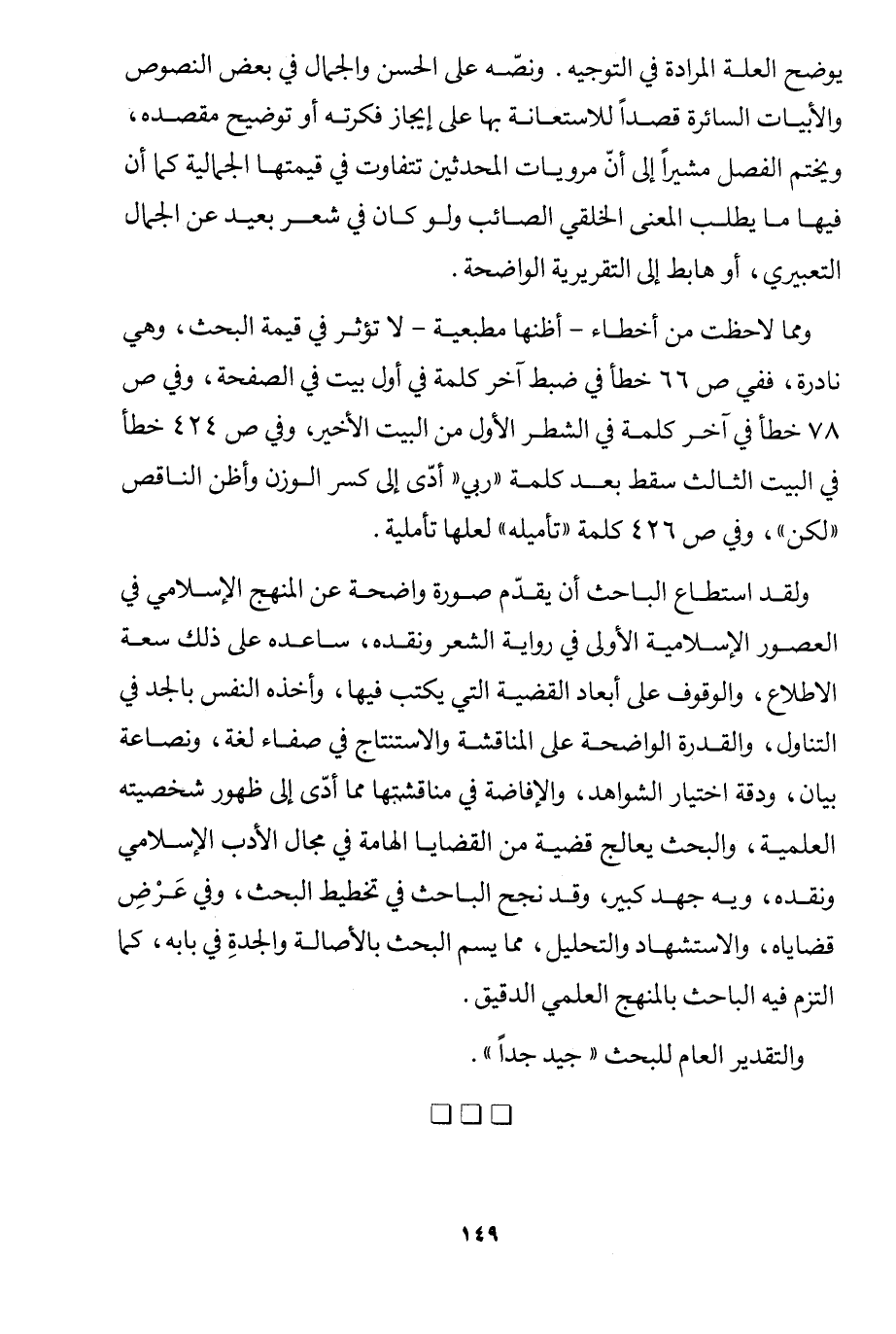ولقد استطاع الباحث أن يقدم صورة واضحة عن المنهج الإسلامي في العصور الإسلامية الأولى في رواية الشعر ونقده، ساعده على ذلك سعة الاطلاع، والوقوف على أبعاد القضية التي يكتب فيها، وأخذه النفس بالجد في التناول، والقدرة الواضحة في المناقشة والاستنتاج في صفاء لغة، ونصاعة بيان، ودقة اختيار الشواهد، والإفاضة في مناقشتها؛ مما أدى إلى ظهور شخصيته العلمية. والبحث يعالج قضية من القضايا الهامة في مجال الأدب الإسلامي ونقده، وبه جهد كبير، وقد نجح الباحث في تخطيط البحث، وفي عرض قضاياه، والاستشهاد والتحليل، مما يسم البحث بالأصالة والجدة في بابه، كما التزم فيه الباحث بالمنهج العلمي الدقيق.