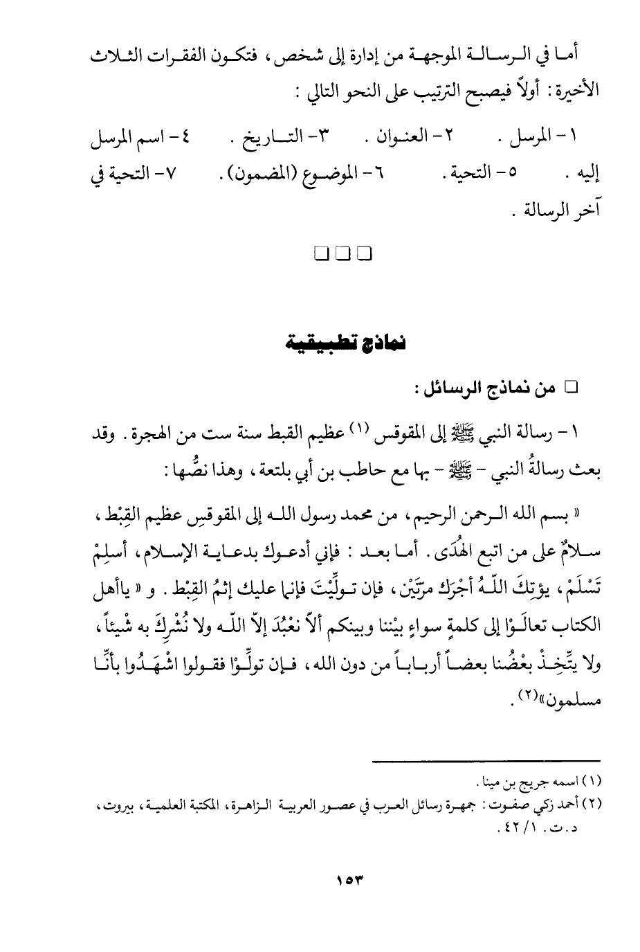 2 أحمد زكي صفوت: جمهرة رسائل العرب في عصور العربية الزاهرة، المكتبة العلمية، بيروت، د. ت، 1/ 42.