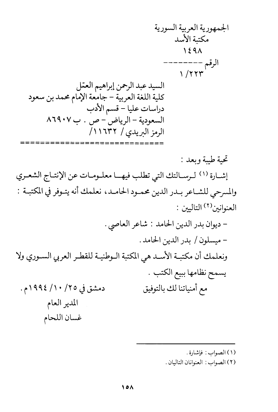 إشارة1 لرسالتك التي تطلب فيها معلومات عن الإنتاج الشعري والمسرحي للشاعر بدر الدين محمود الحامد، نعلمك أنه يتوفر في المكتبة: العنوانين2 التاليين: