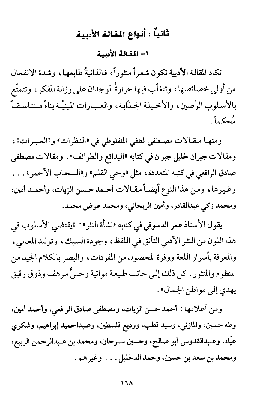 ومنها مقالات مصطفى لطفي المنفلوطي في "النظرات" و"العبرات"، ومقالات جبران خليل جبران في كتابه "البدائع والطرائف"، ومقالات مصطفى صادق الرافعي في كتبه المتعددة، مثل "وحي القلم" و"السحاب الأحمر".. وغيرها، ومن هذا النوع أيضًا مقالات أحمد حسن الزيات، وأحمد أمين، ومحمد زكي عبد القادر، وأمين الريحاني، ومحمد عوض محمد.