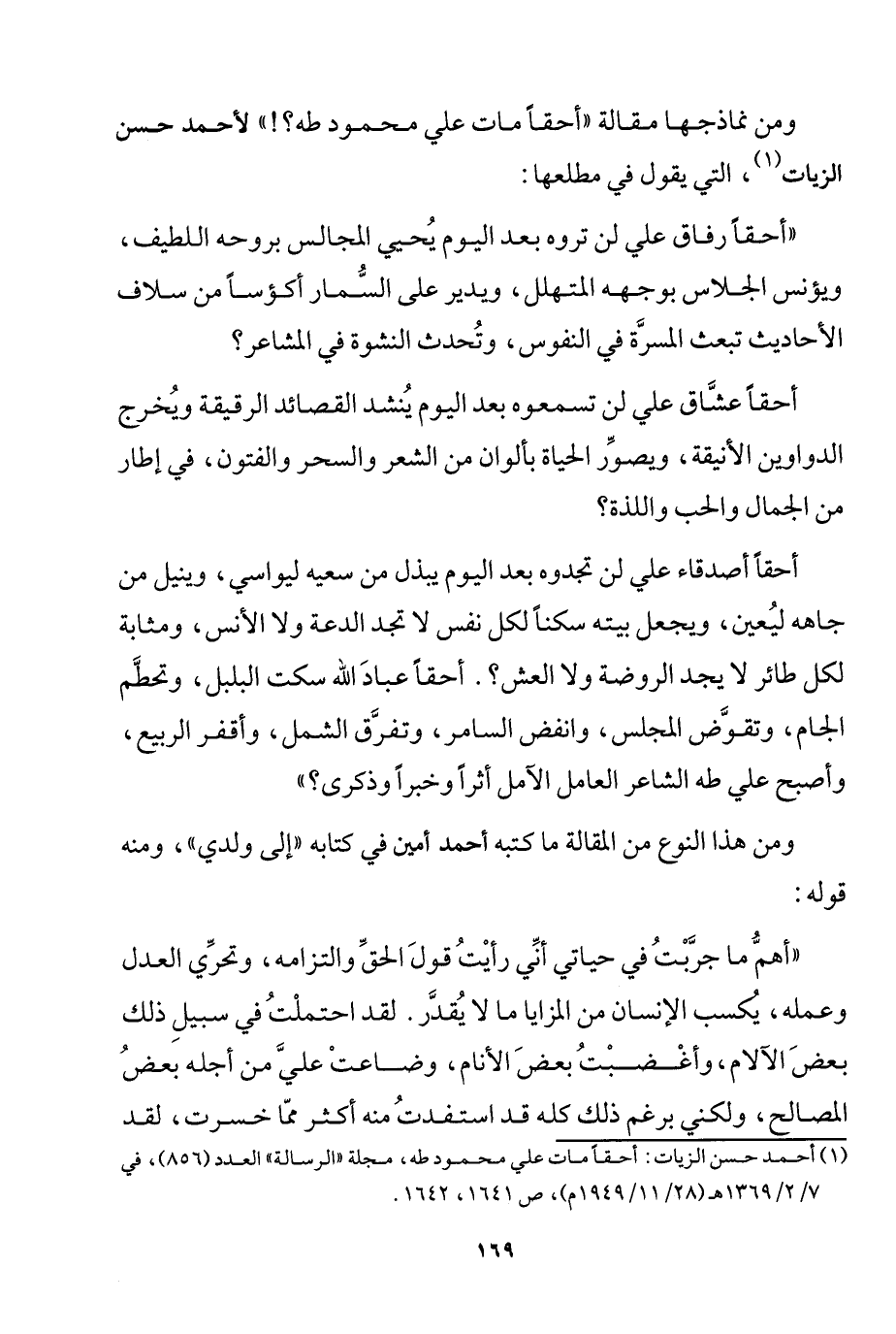 1 أحمد حسن الزيات: أحقًّا مات علي محمود طه، مجلة "الرسالة" العدد"856"، في 7/ 2/ 1369هـ "28/ 11/ 1949م"، ص 1641، 1642.