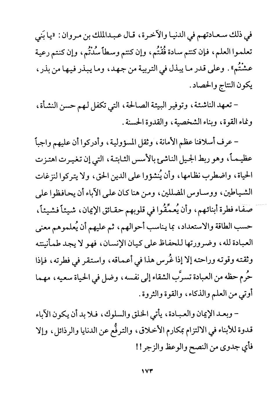 في ذلك سعادتهم في الدنيا والآخرة، قال عبد الملك بن مروان: "يا بَنِيَّ، تعلموا العلم، فإن كنتم سادة فقْتُم، وإن كنتم وسطًا سدتم، وإن كنت رعية عشتم". وعلى قدر ما يبذل في التربية من جهد، وما يبذر فيها من بذر، يكون النتاج والحصاد.