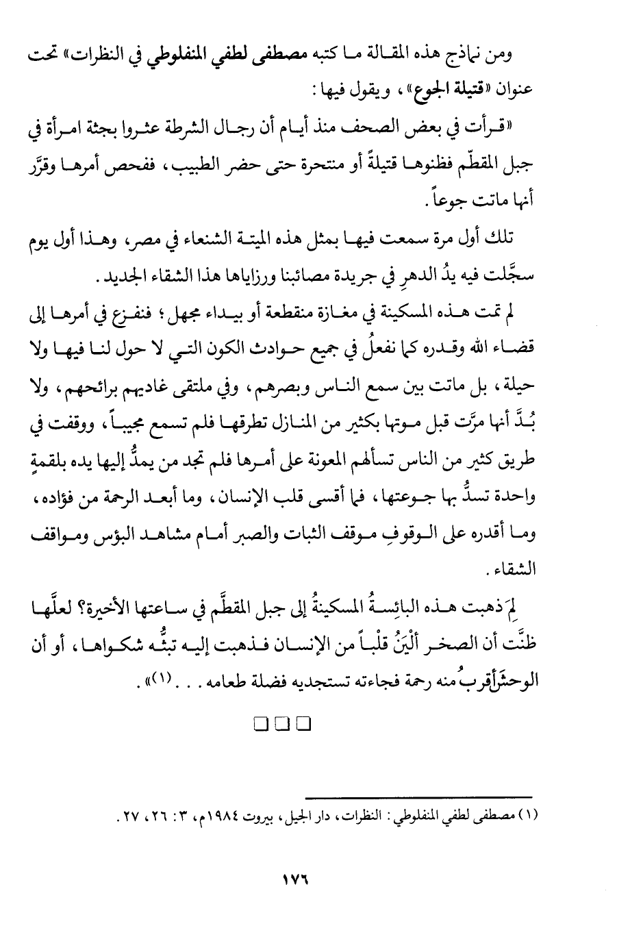 1 مططفى لطفي المنفلوطي: النظرات، دار الجيل، بيروت 1984م،3: 26، 27.